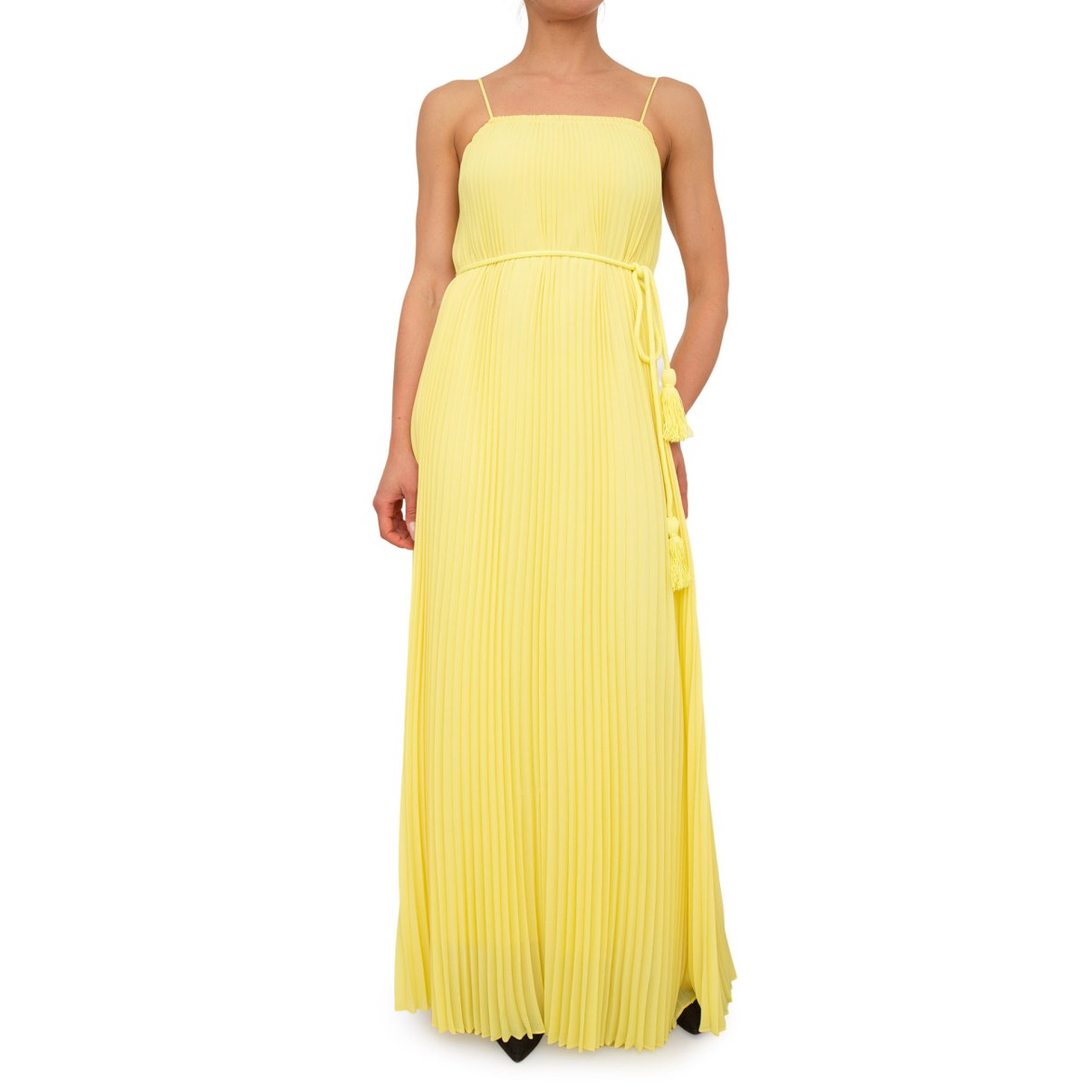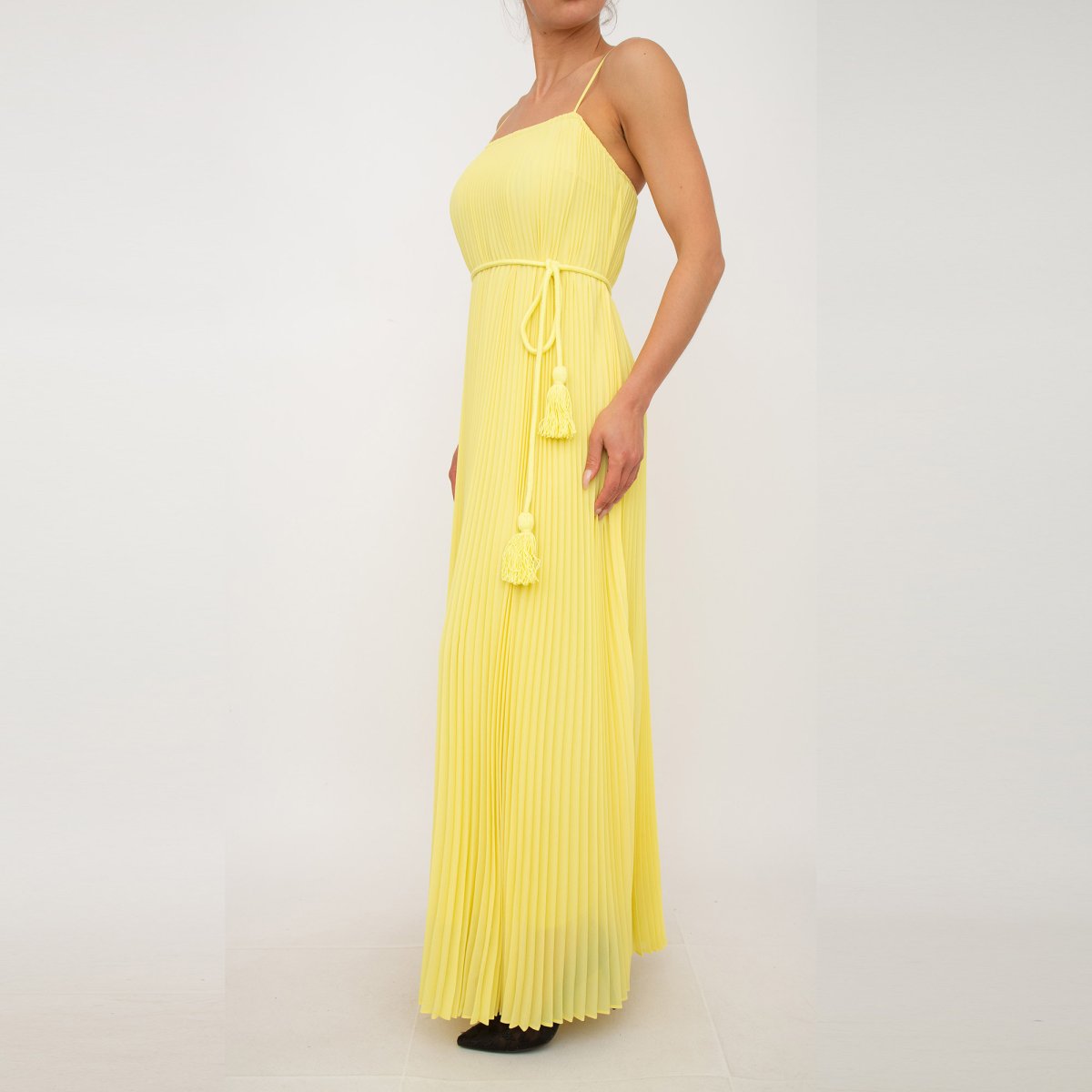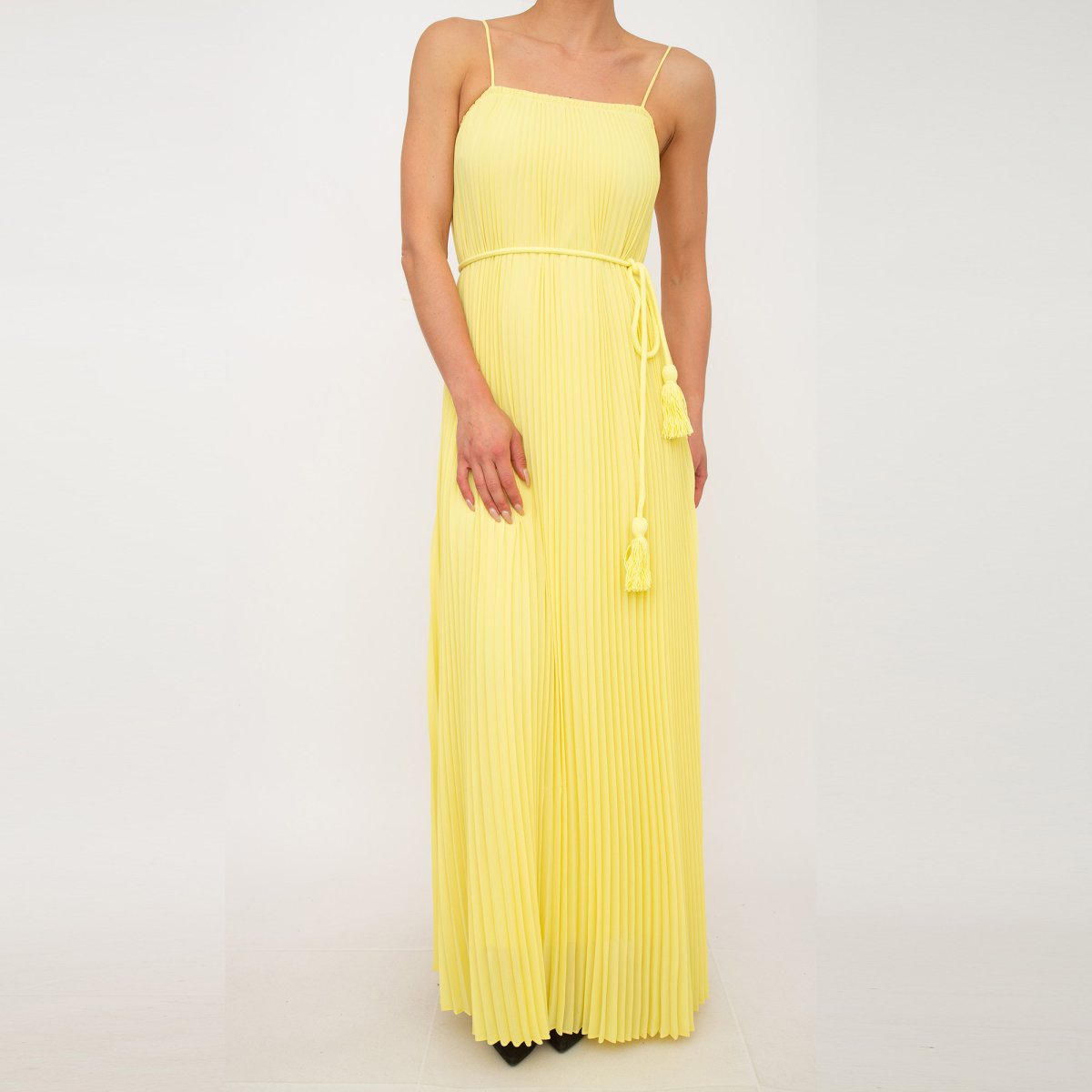 Abito lungo in georgette plissé con spalline sottili, cintura rimovibile in corda con nappine, foderato.