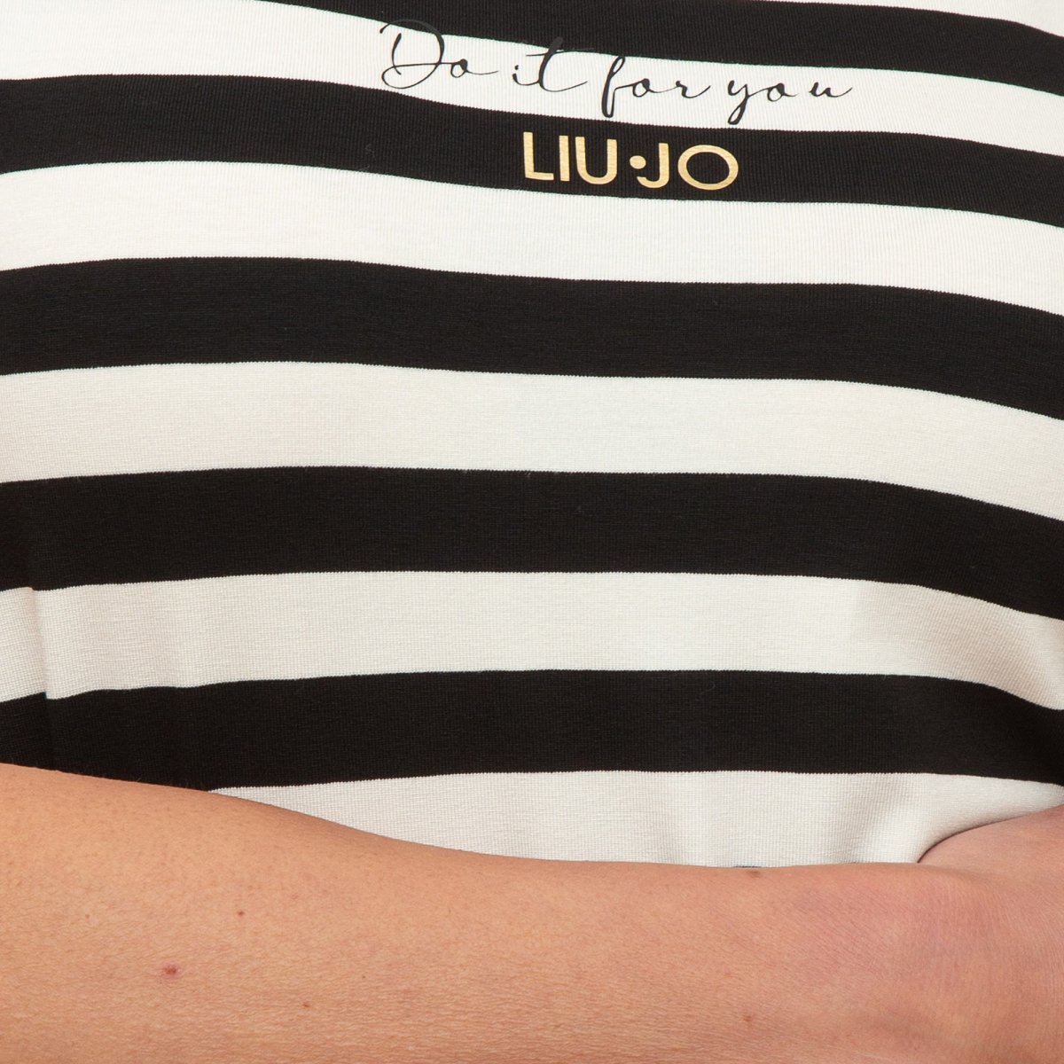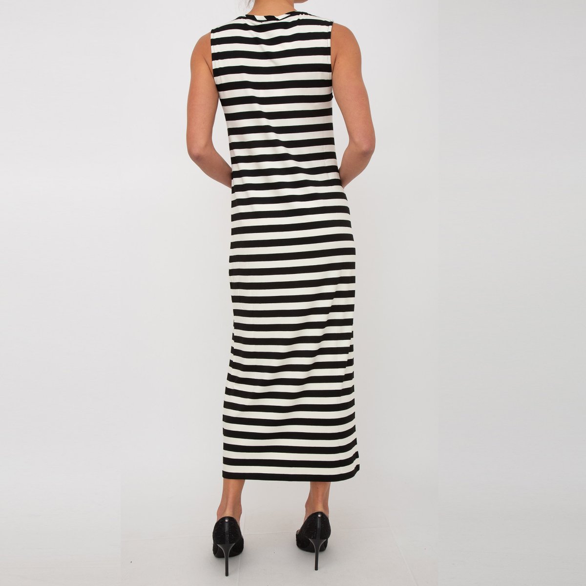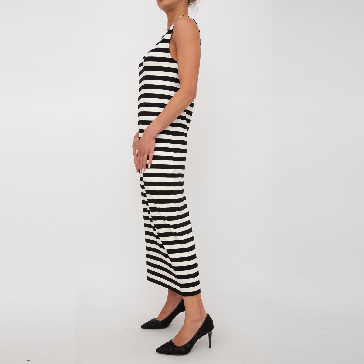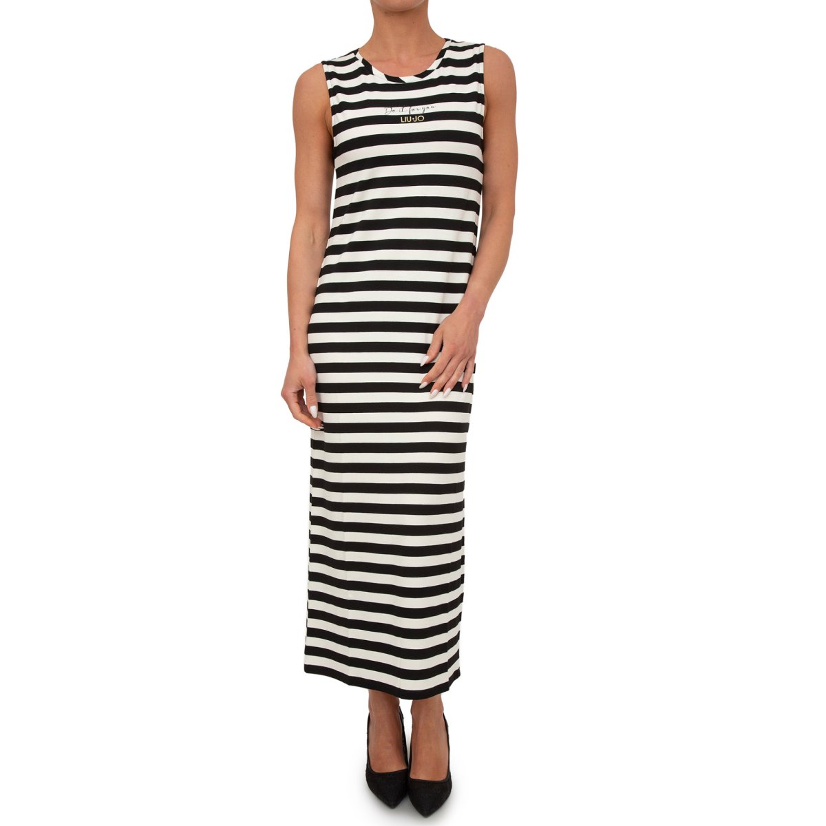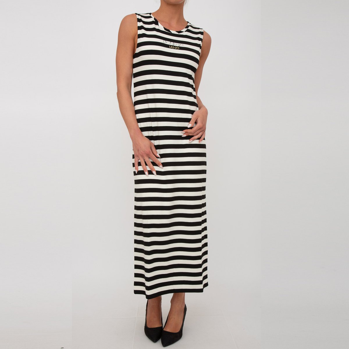 Vestito in jersey di viscosa stretch, stampa a righe all over, scollo rotondo, sorretto da spalline larghe, stampa logo laminato e lettering sul davanti. Made in Italy.