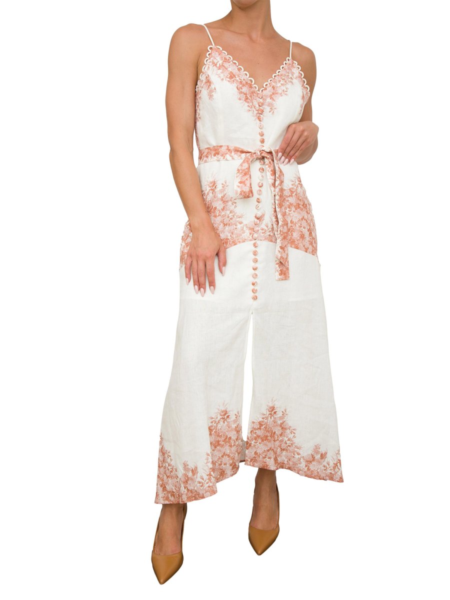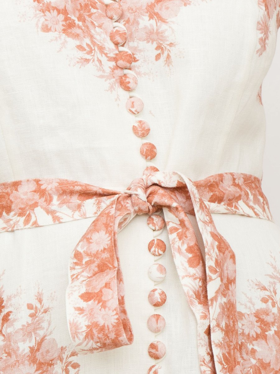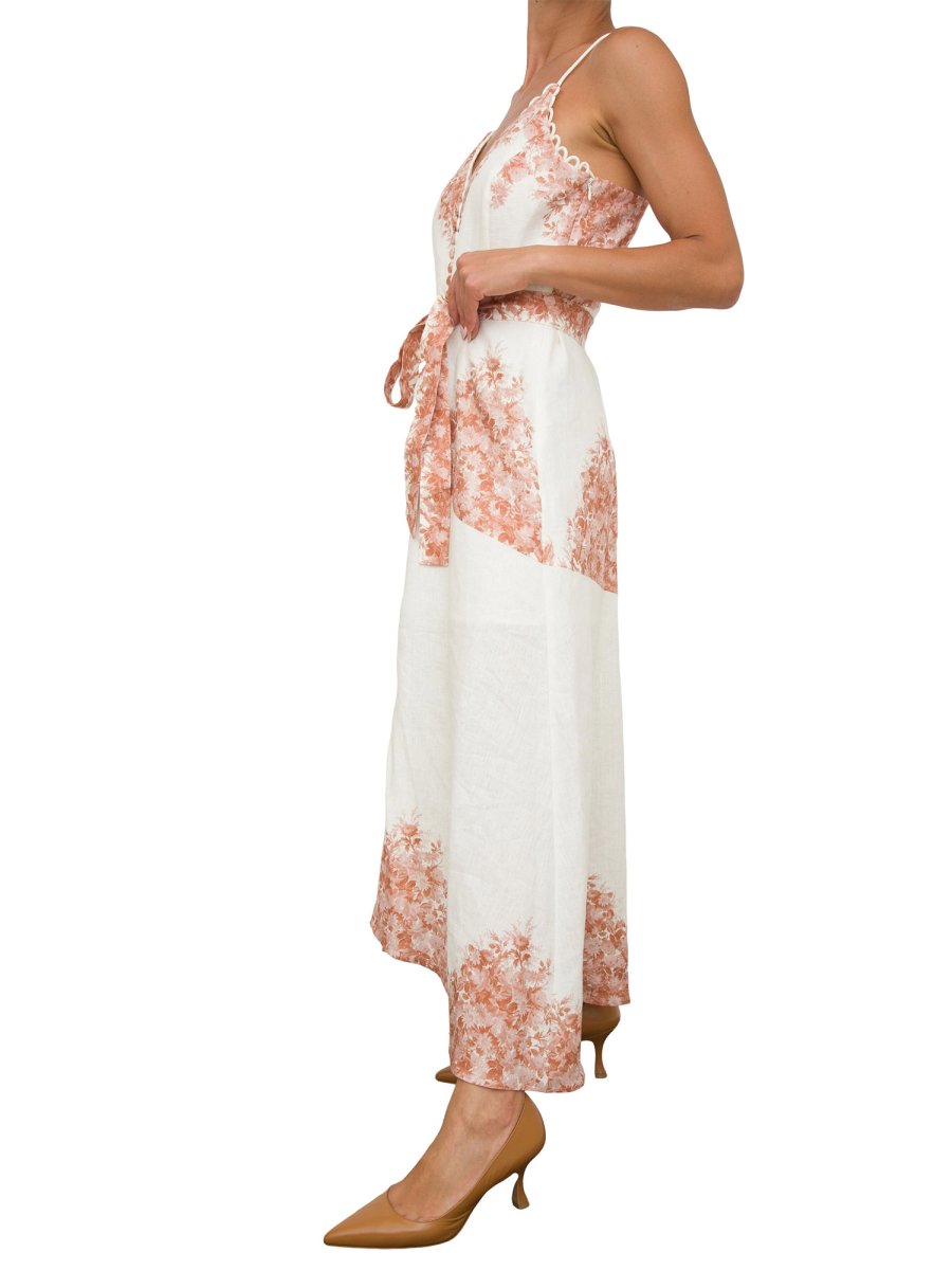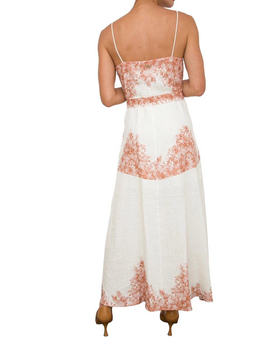 Abito longuette in lino mano naturale con disegno piazzato a fiori, spalline sottili, scollatura a V, chiusura con bottoni ricoperti.