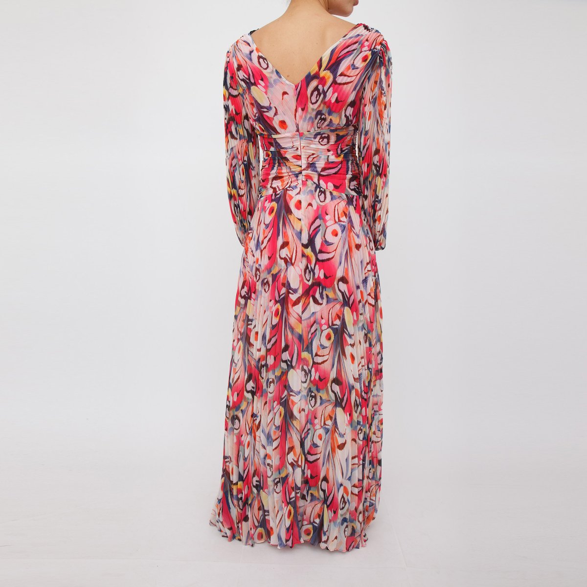 Abito lungo in tessuto sintetico, scollo a V, manica lunga, fit and flare, aperto sulla schiena con cerniera lampo.
