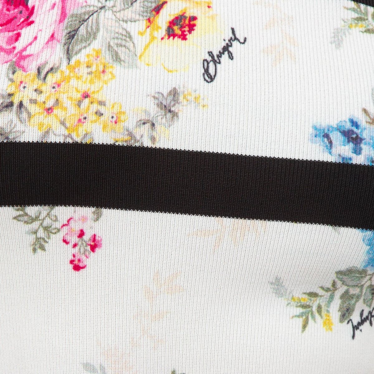 Abito in filato di viscosa a fantasia floreale con righe orizzontali. Linea Fitted, collo tondo, maniche lunghe, oblò profondo sulla schiena con linea che continua sul retro effetto nastro.