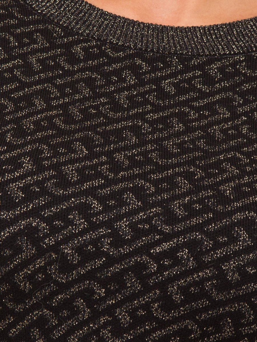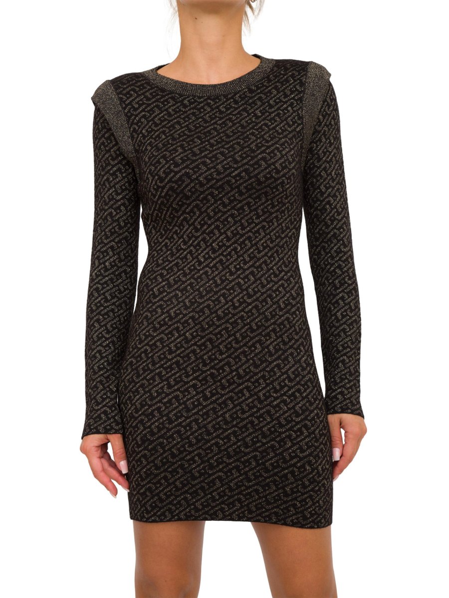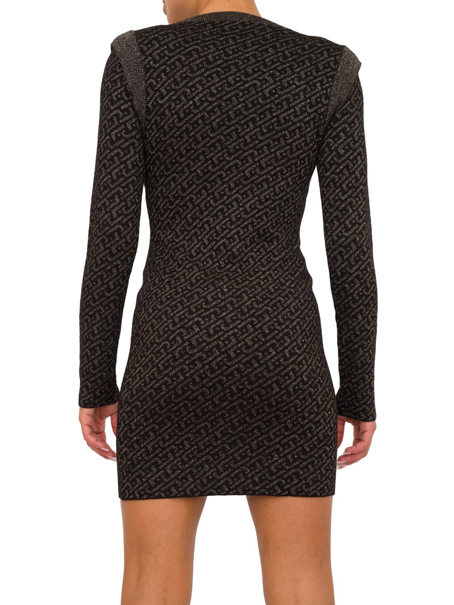 Abito in maglia corto Liu-Jo con logo jacquard all over, interventi in lurex®, taglio girocollo, maniche lunghe, dettaglio spalline e vestibilità aderente.