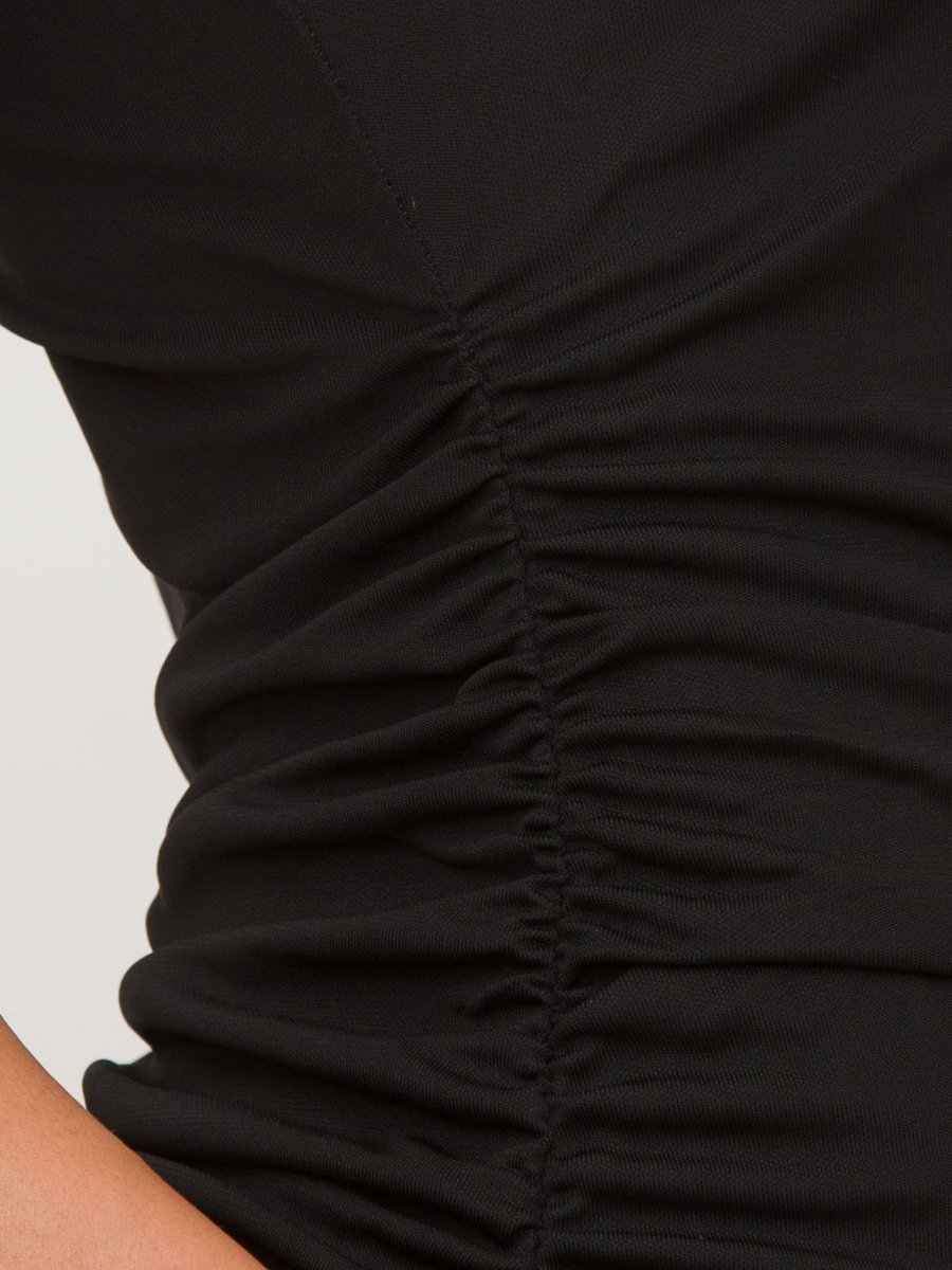Abito longuette in jersey di viscosa crêpe con drappeggi ai fianchi, collo tondo, spalle larghe, scollatura dietro con fibbia Oval T.