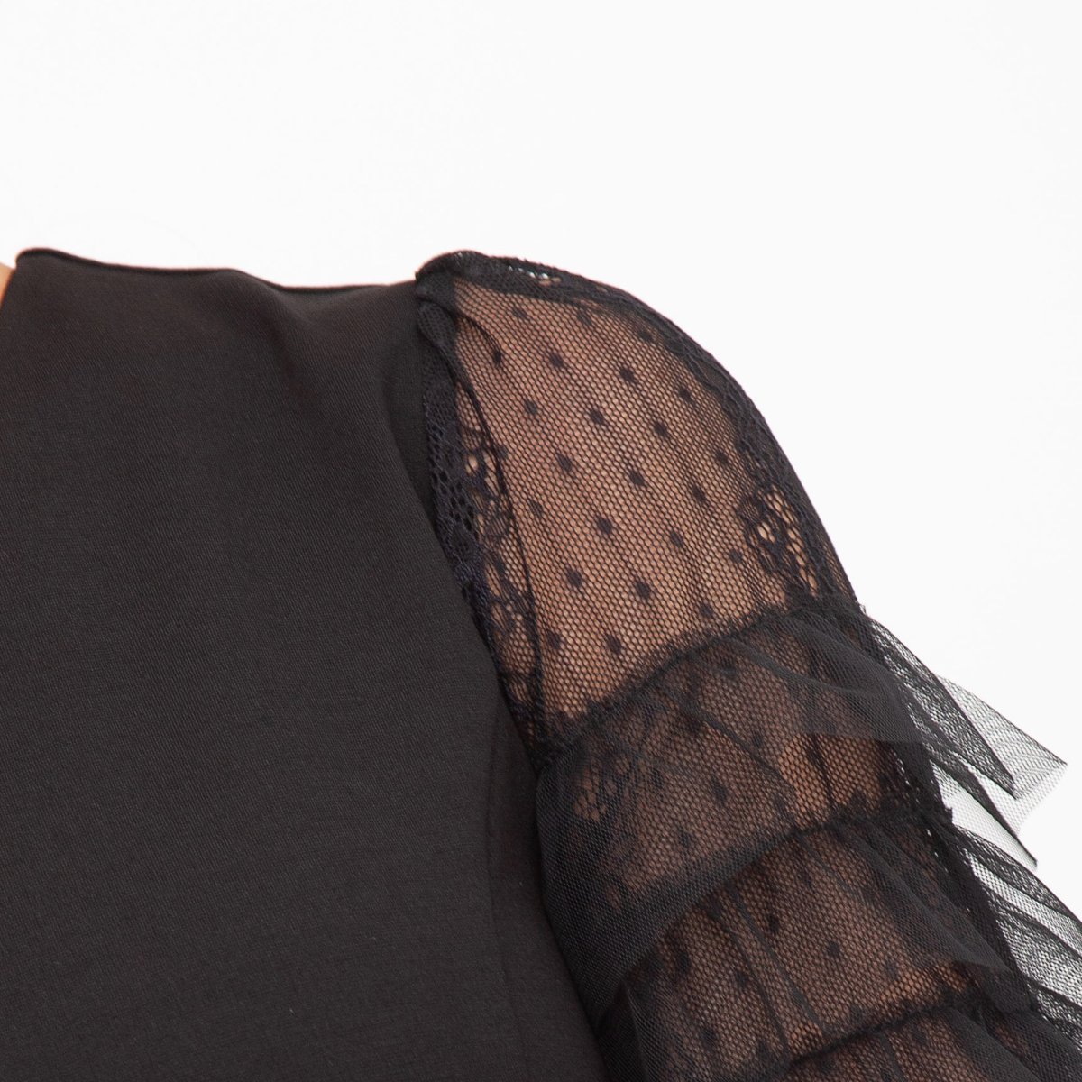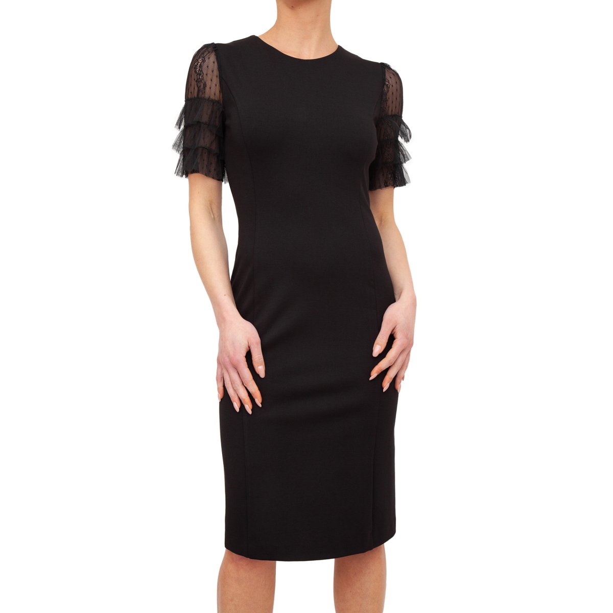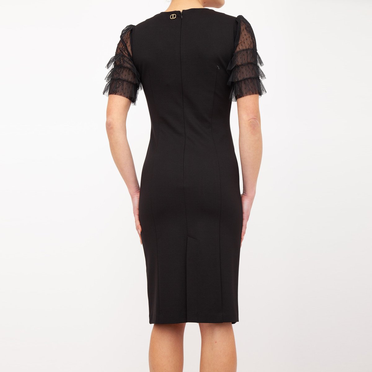 Abito corto in punto Milano stretch con maniche corte in tulle plumetis rifinite da volant, linea dritta.