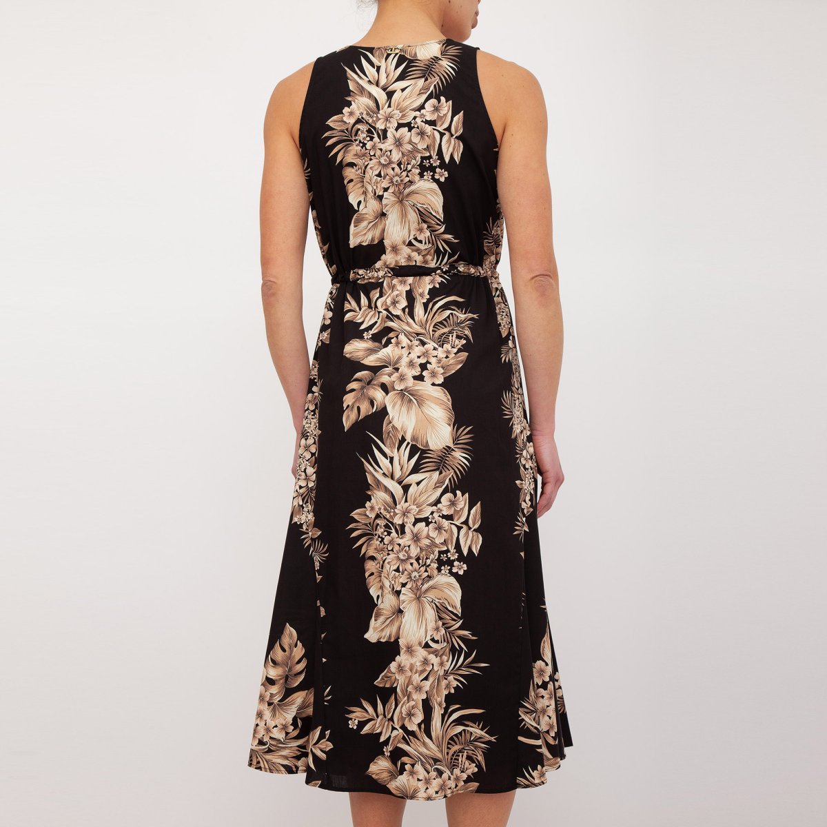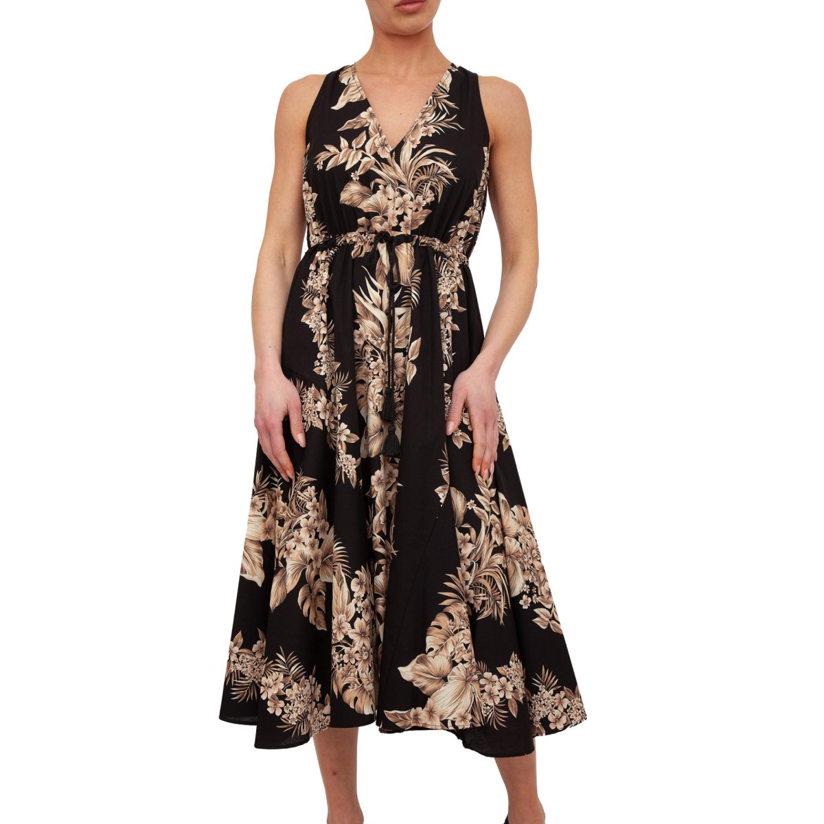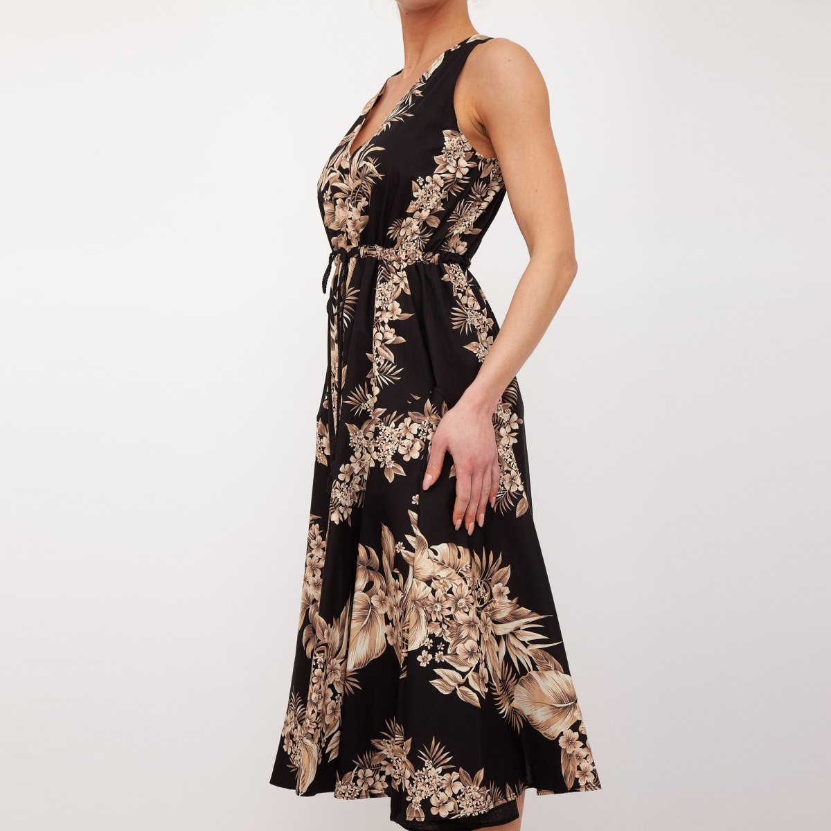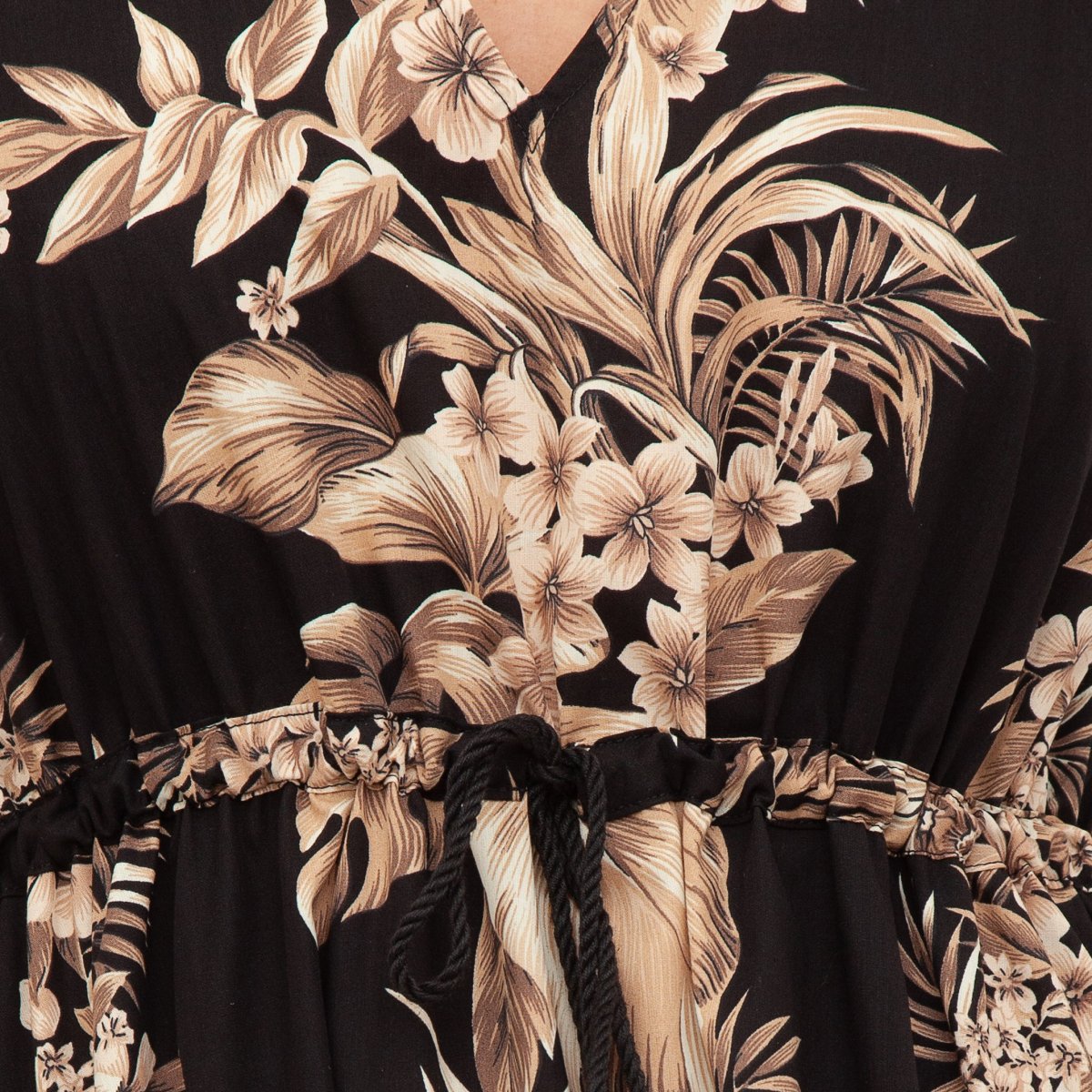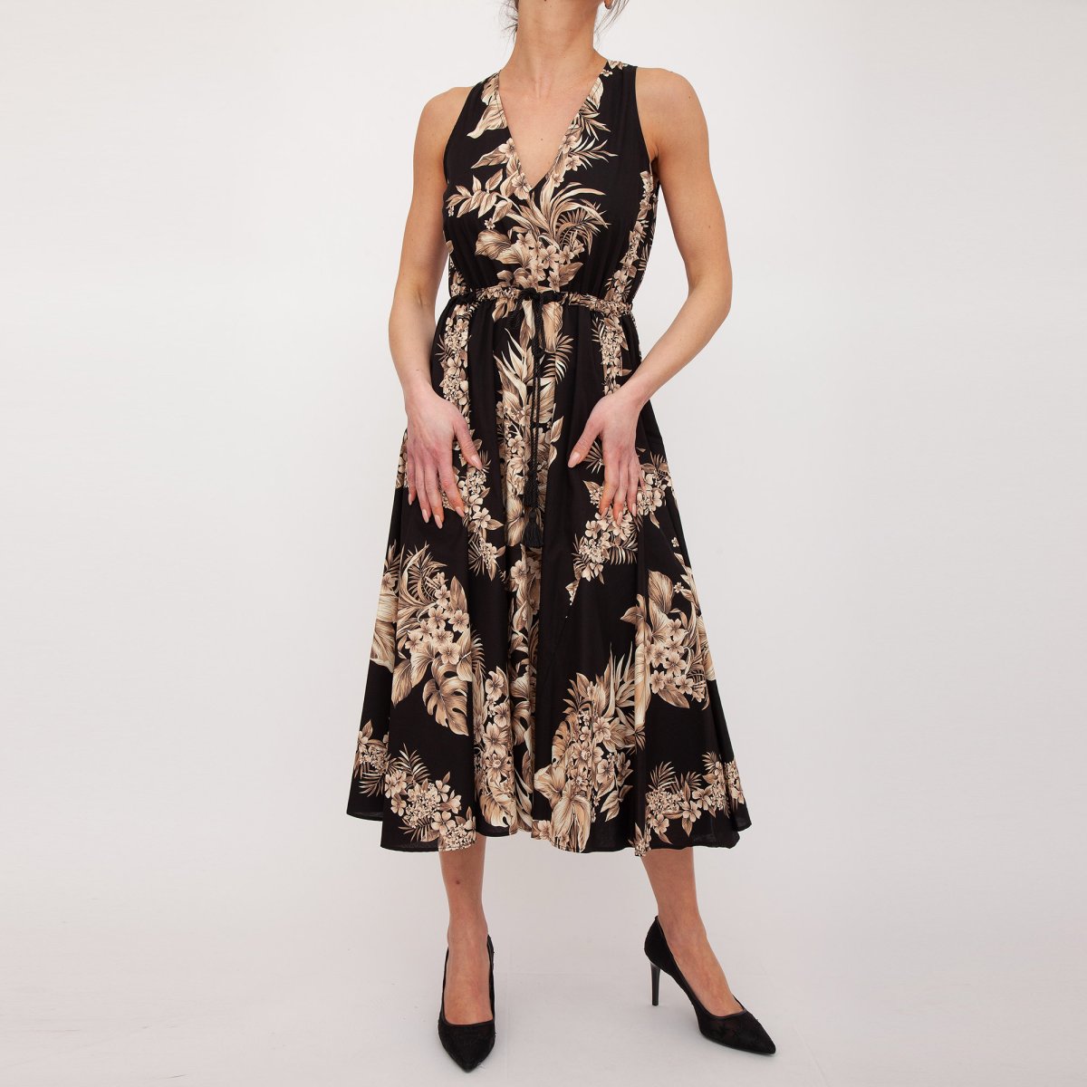 Abito lungo in popeline di cotone con stampa piazzata a fiori e foglie, scollo a V, coulisse in vita, gonna svasata, zip al fianco.