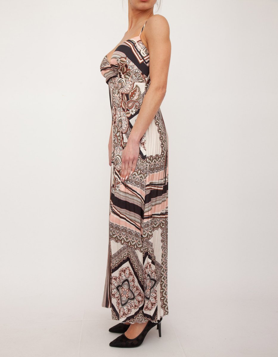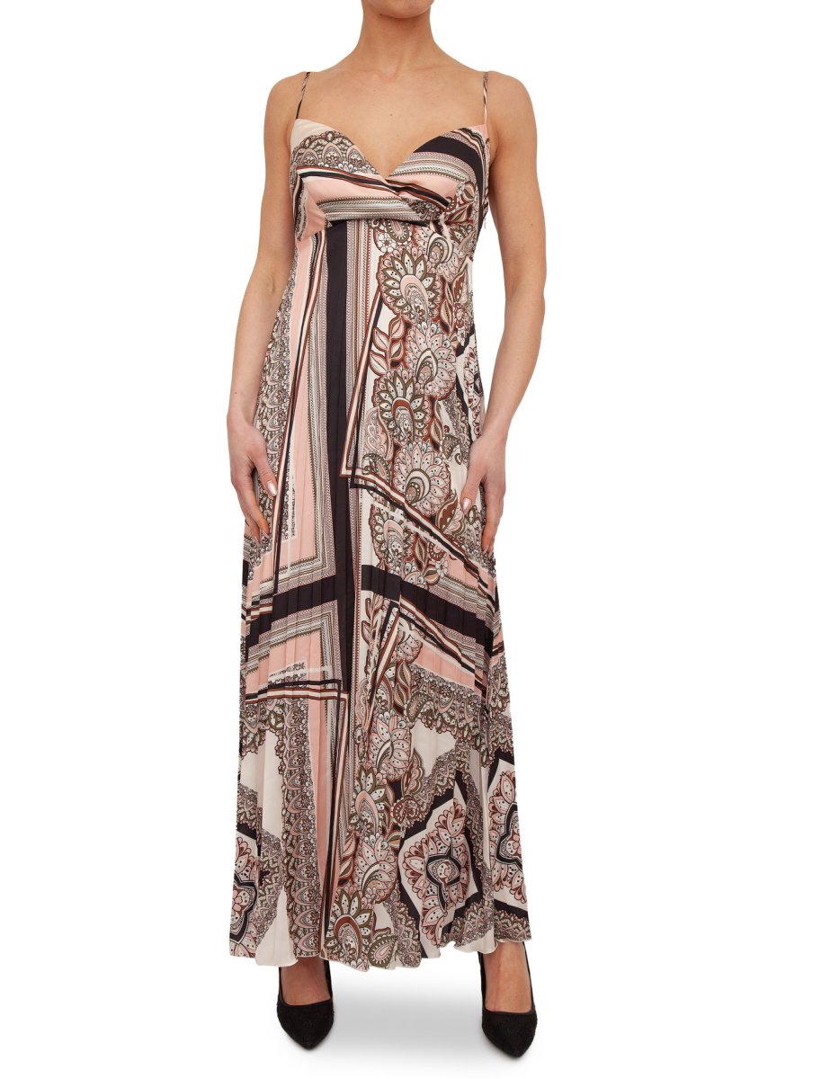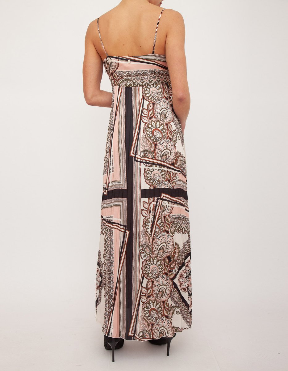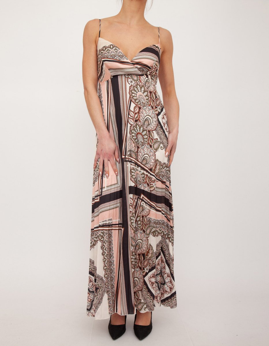 Vestito in raso, stampa foulard all over, scollo a V, sorretto da spalline sottili, gonna plissé e logo in metallo sul retro.