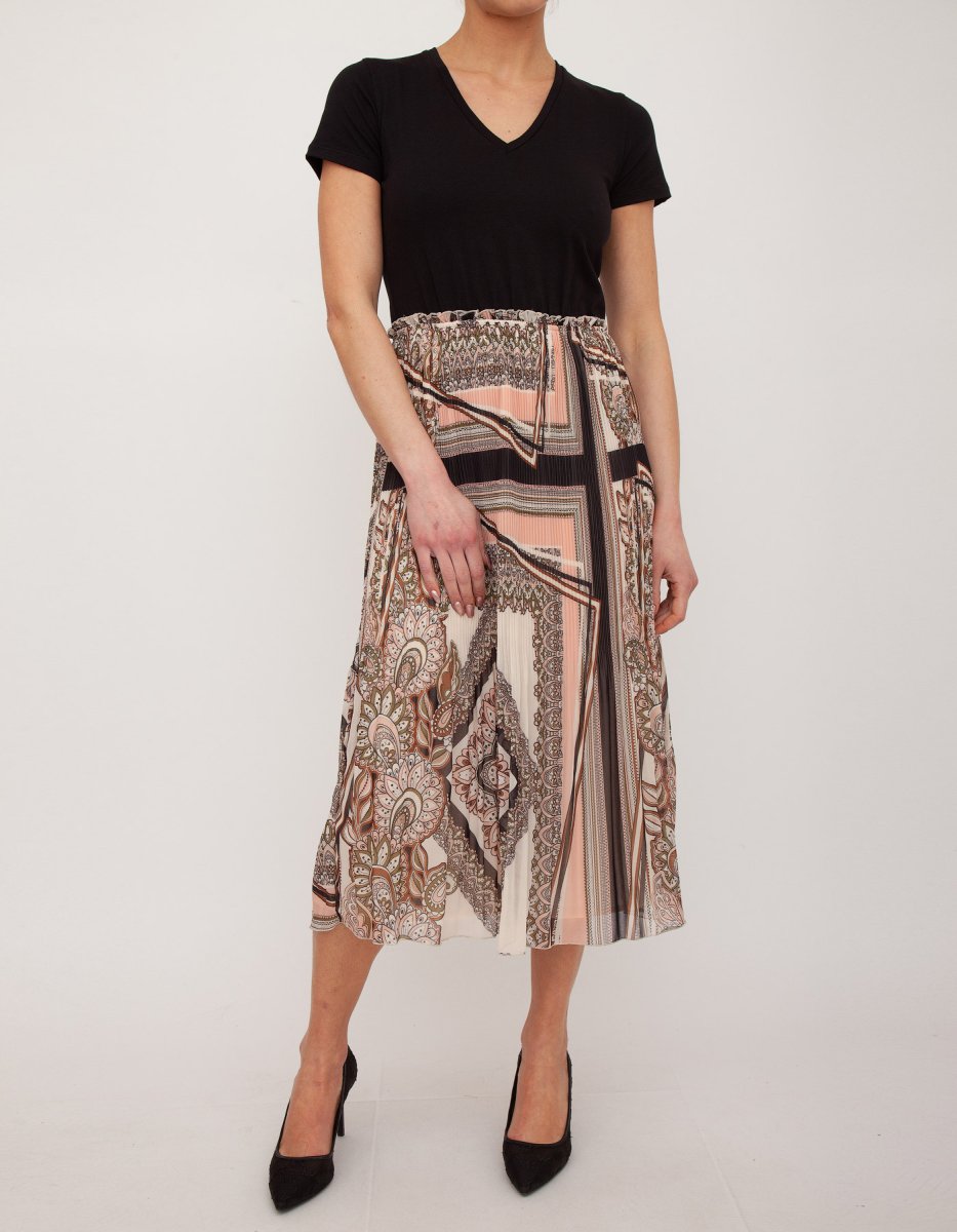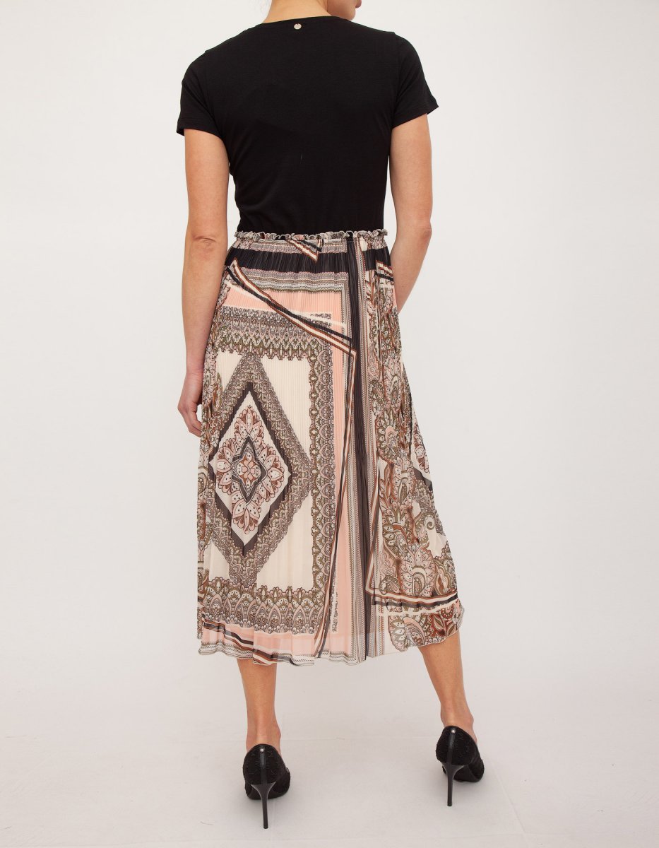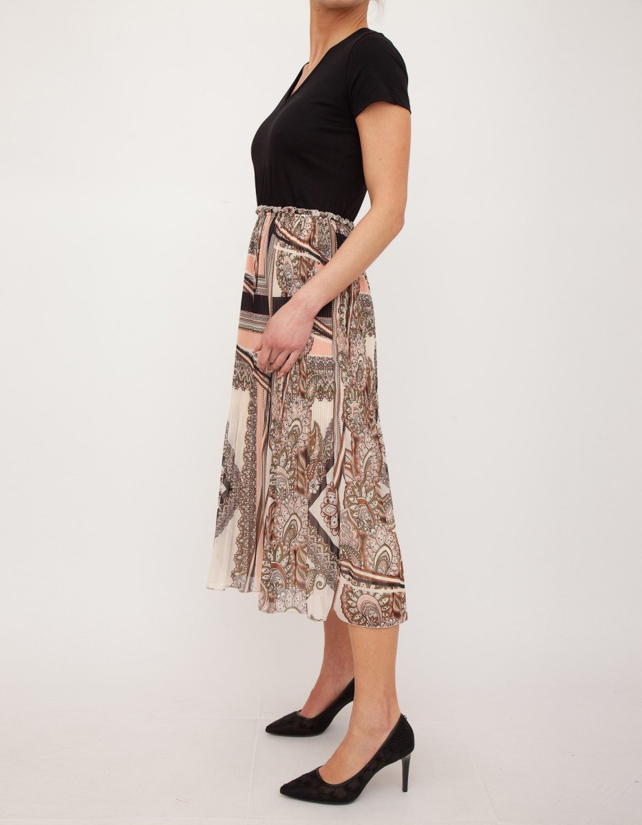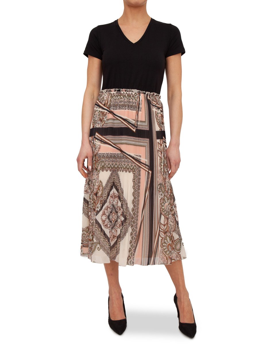 Vestito effetto layering, top in jersey, maniche corte, logo in metallo sul retro, cintone elastico in vita e gonna plissé in georgette. Stampa foulard. Made in Italy.