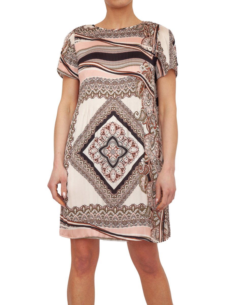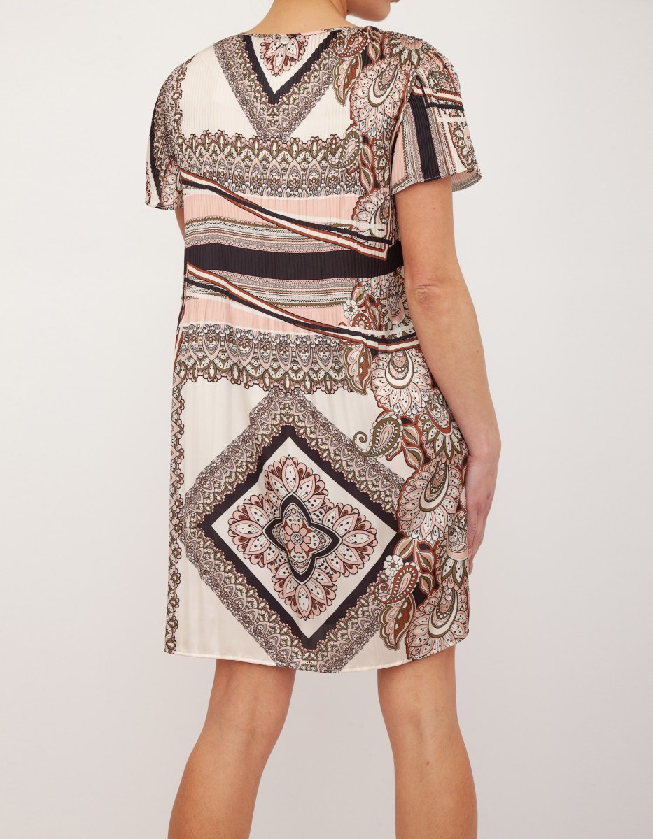 Vestito in raso, stampa foulard all over, motivo plissé, scollo rotondo, maniche corte e logo in metallo sul retro.