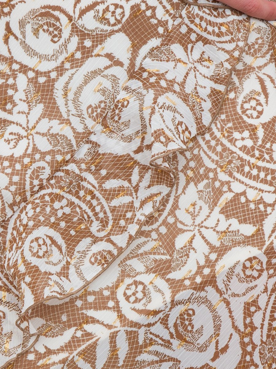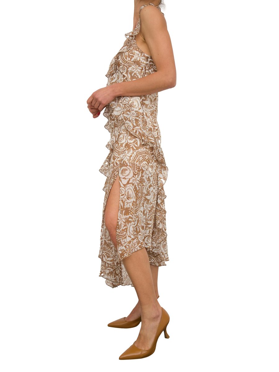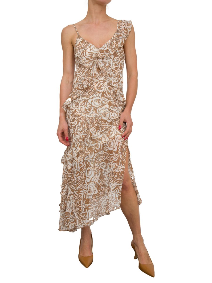 Abito da cerimonia in creponne e lurex®, dettagli in pizzo all over, scollo a V con spalline sottili, orlo asimmetrico e mini logo in metallo sul retro.