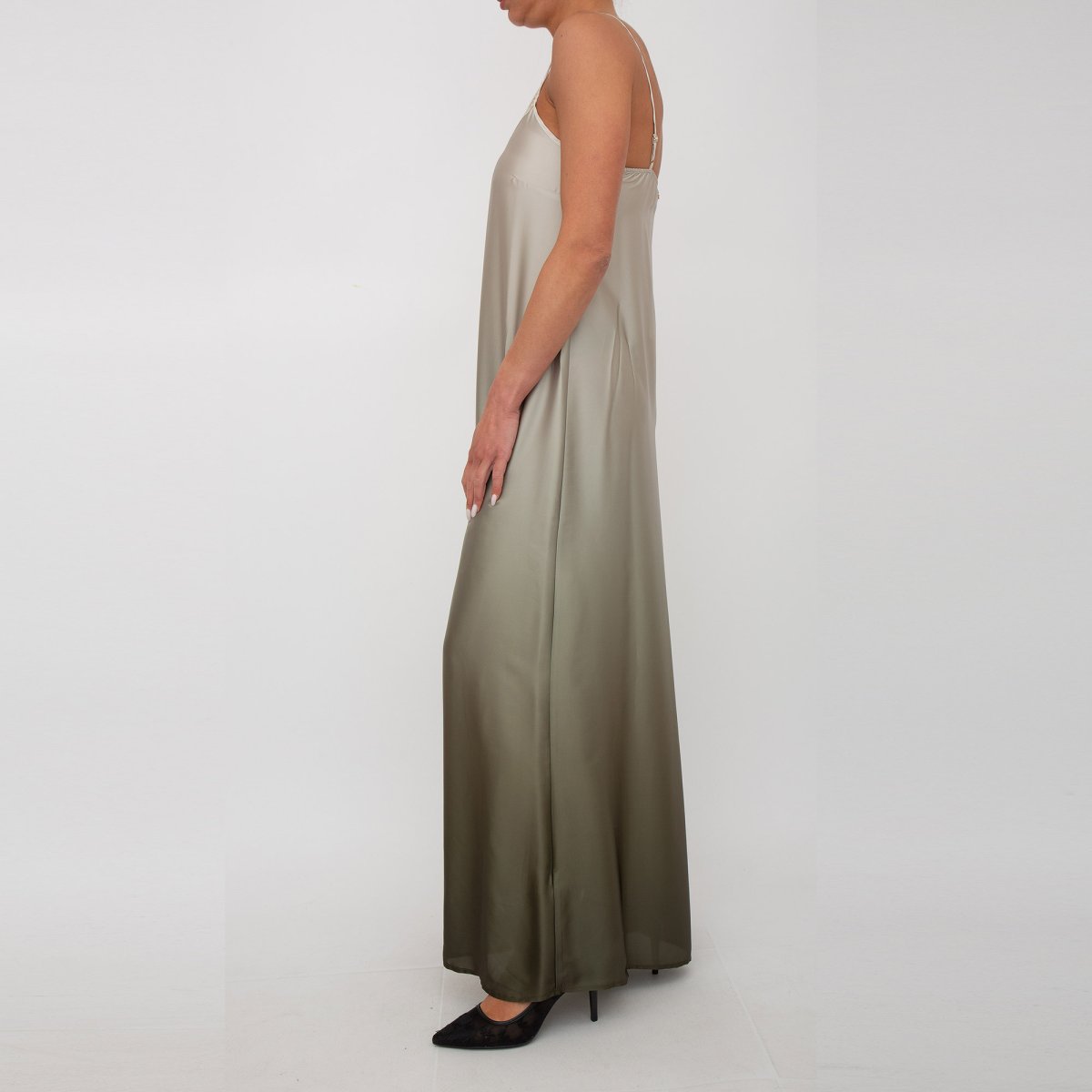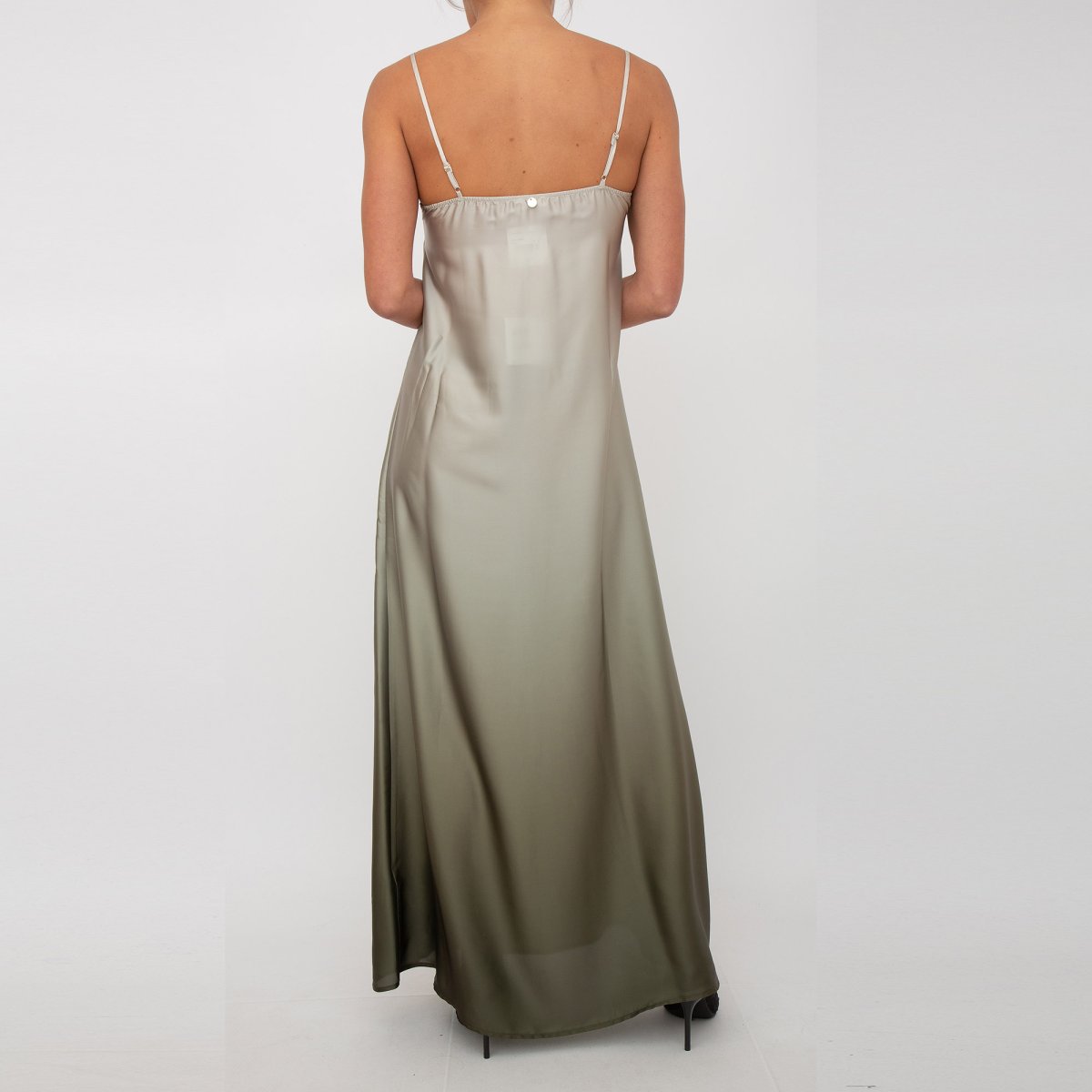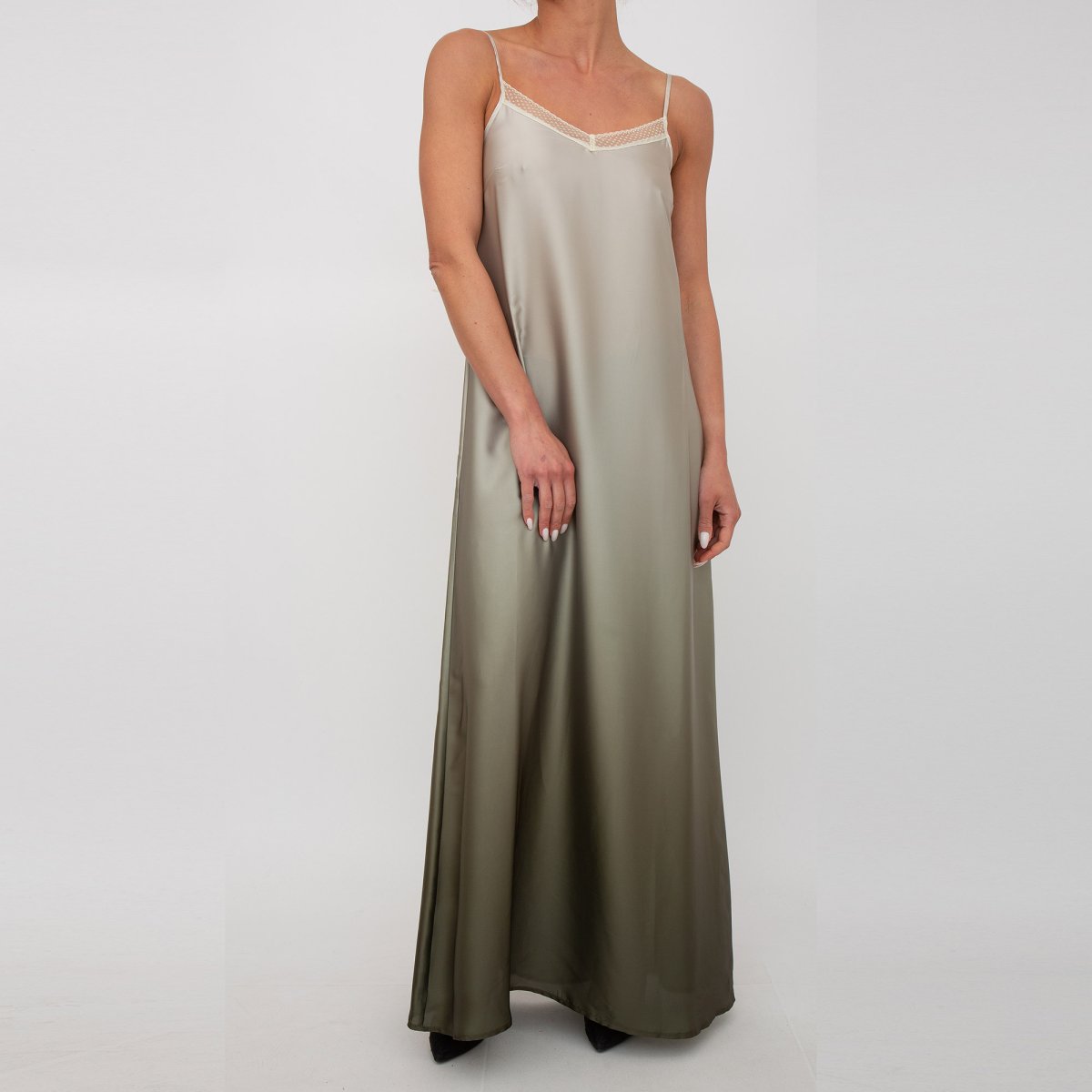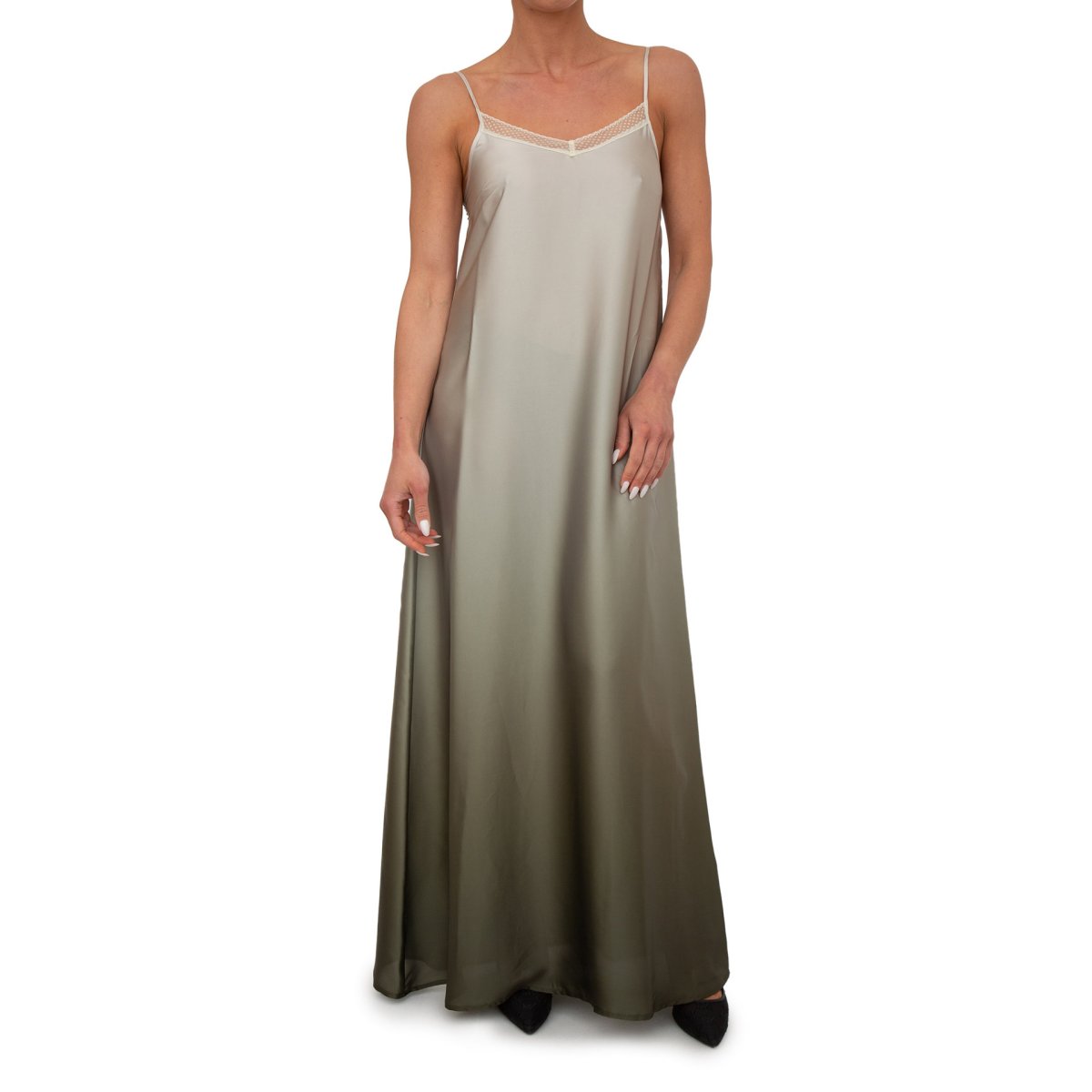 Vestito in raso, dettagli in pizzo, scollo a V, sorretto da spalline sottili regolabili e logo in metallo sul retro. Made in Italy