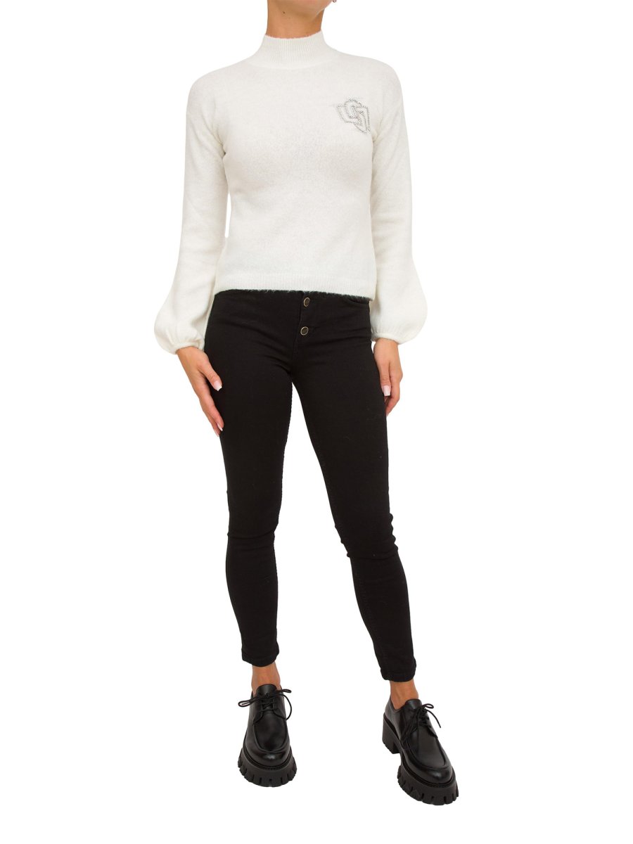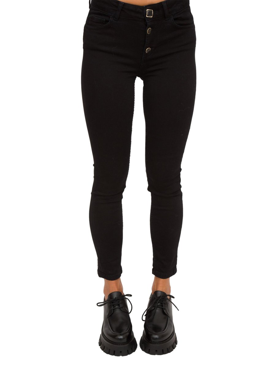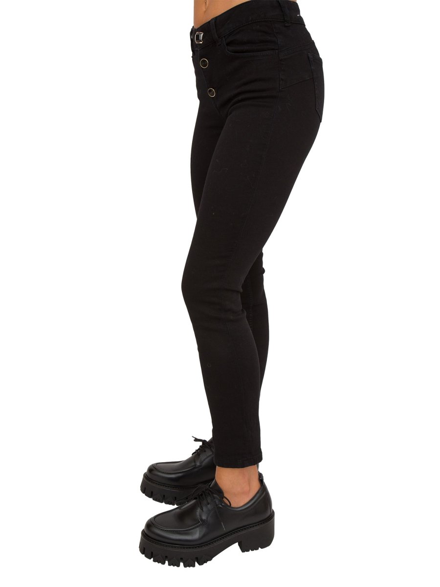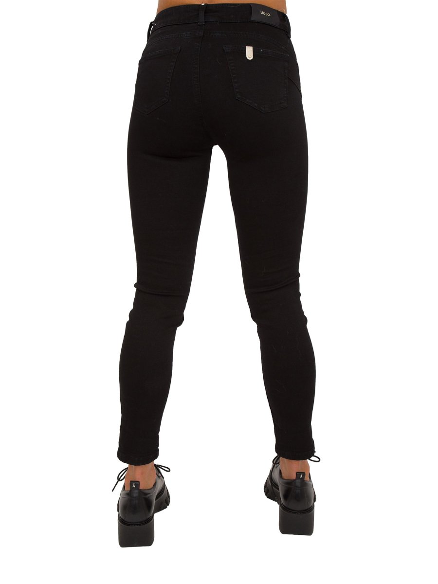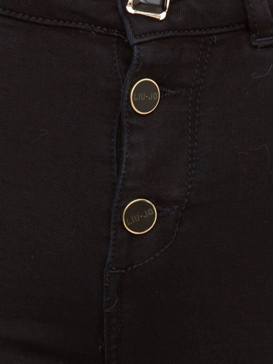 Jeans da donna Liu-Jo cropped in denim di cotone stretch, vita alta, tagli bottom up, modello cinque tasche, gamba skinny con risvolto al fondo, salpa logata, logo in metallo sul retro e chiusura con bottoni gioiello.