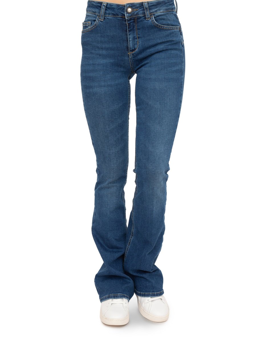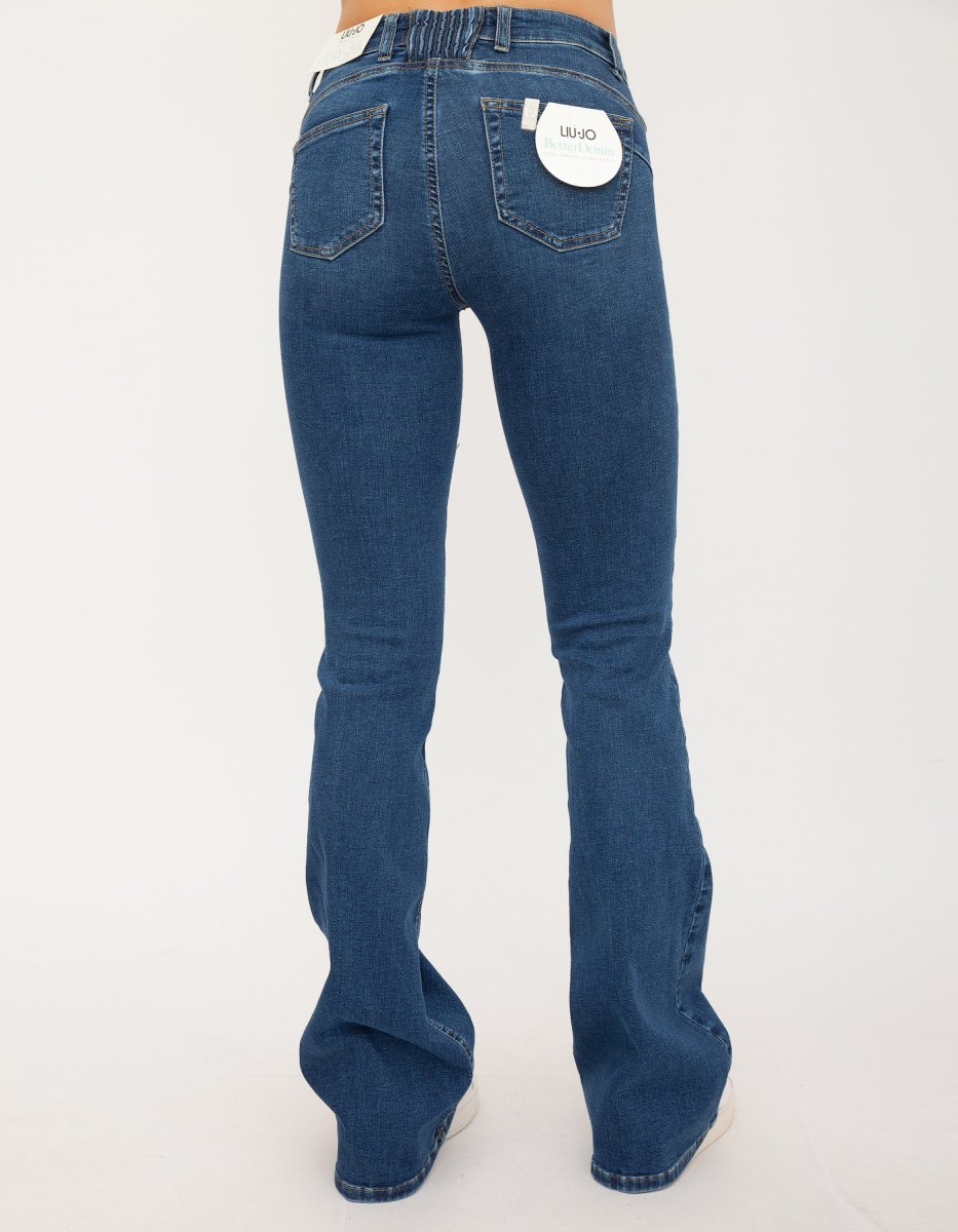 Jeans bottom up in denim di cotone stretch, lavaggio used, piega stirata, vita regolare, modello cinque tasche, gamba flare, inserto elastico al punto vita sul retro, logo sul retro e chiusura con bottone e zip nascosta.