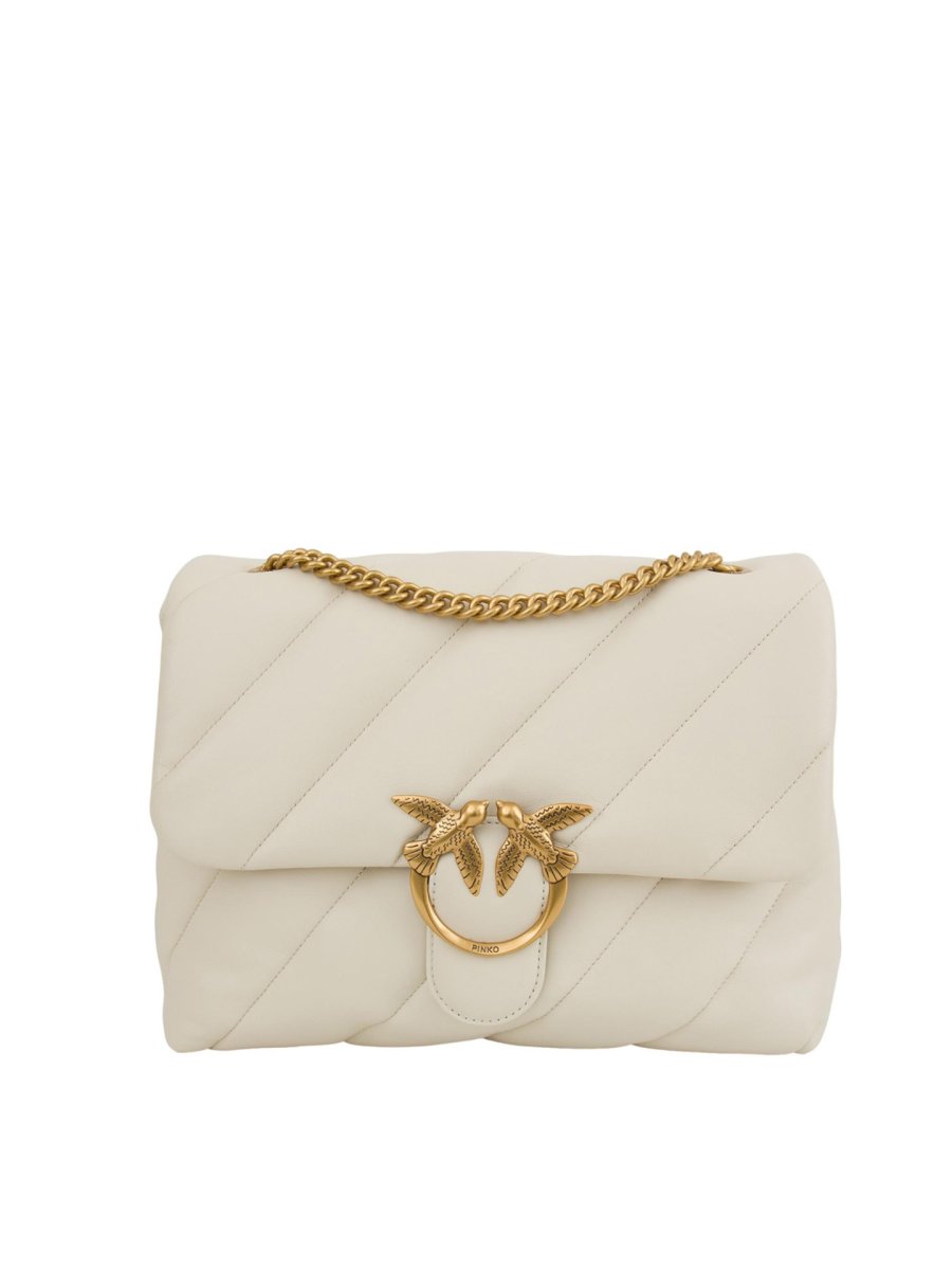 Borsa Pinko Big Love Bag Puff in morbida nappa con maxi trapuntatura obliqua. La chiusura è completata dall'iconica fibbia in metallo Love Birds Diamond Cut. L'interno è foderato in microfibra scamosciata e comprende tramezza chiusa con zip e tasca a parete. La tracolla combina la classica catena metallica rotonda al pratico spallaccio in nappa. Altezza: 24 cm Larghezza: 11 cm Lunghezza: 32 cm.