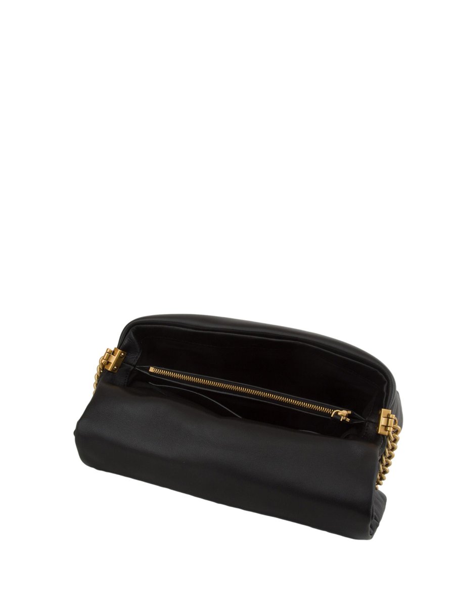 Classic Love Bag Click Puff in morbida nappa. La chiusura automatica nascosta è completata dall'iconica fibbia in metallo Love Birds Diamond Cut con effetto cut-out, ricoperta nella stessa nappa della borsa. L'interno è foderato in microfibra scamosciata e comprende tramezza chiusa con zip e tasca a parete. La tracolla combina la classica catena metallica rotonda al pratico spallaccio regolabile in pelle. Altezza: 19 cm Larghezza: 12 cm Lunghezza: 29 cm.