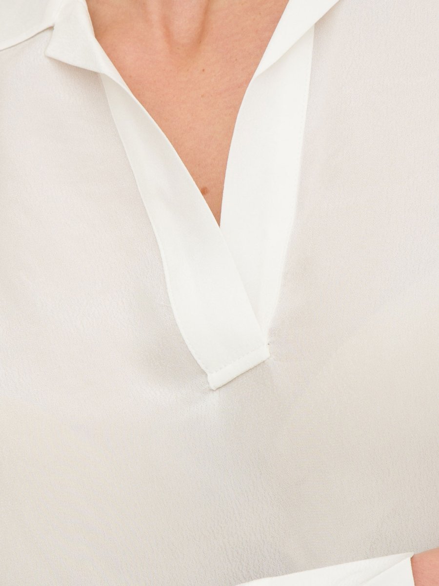 Questa blusa è realizzata in crepe de chine fluida ed è caratterizzata dallo scollo a V con colletto e dalle maniche morbide.