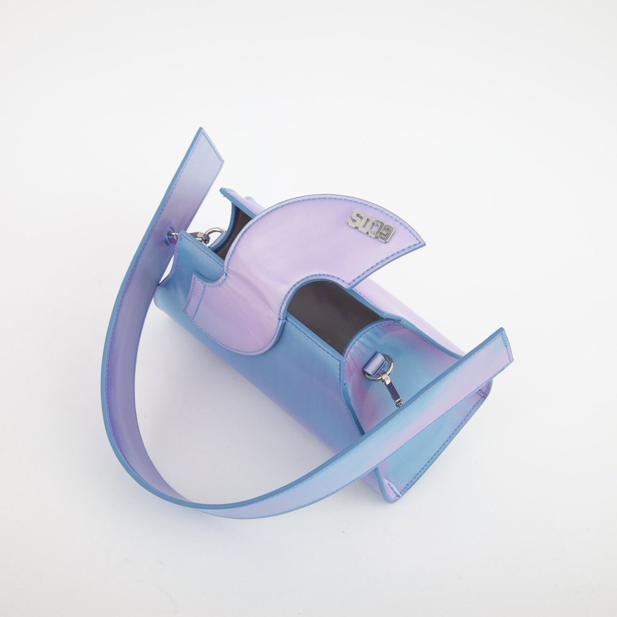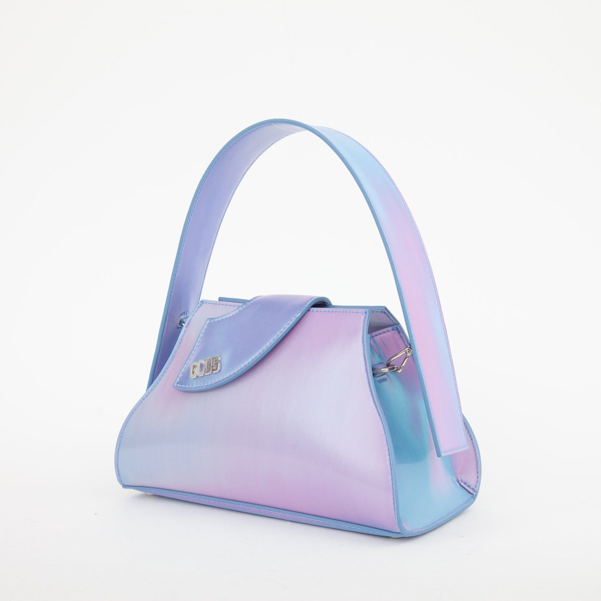 Borsa comma, dalla particolare forma svasata, formato medium, in materiale sintetico olografico. Patta curva asimmetrica, con logo GCDS in nichel lucido sull'estremità e bottone calamitato. Manico con moschettoni semi nascosti. Internamente, fodera con logo jacquard e tasca porta carte con logo impresso a caldo. Fondo con 4 piedini in nichel lucido.