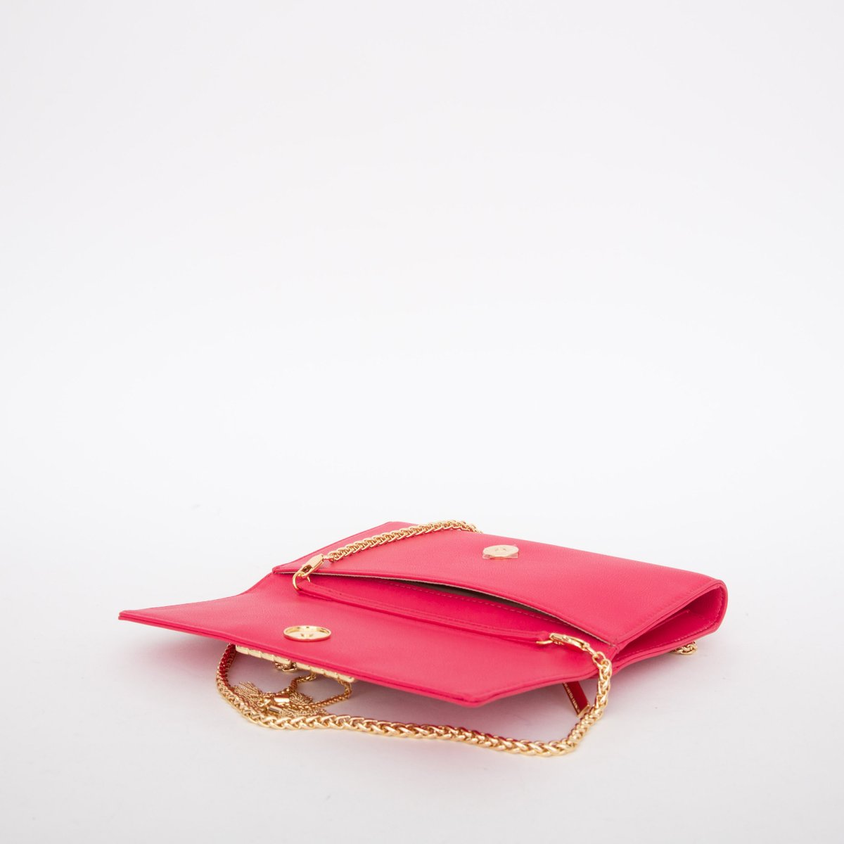 Wallet on chain in pelle sintetica liscia con placca di collezione intrecciata. Tracolla con catena spiga in metallo oro. Fodera in polysuede. L 21,5 x H 12 x P 3 cm.
