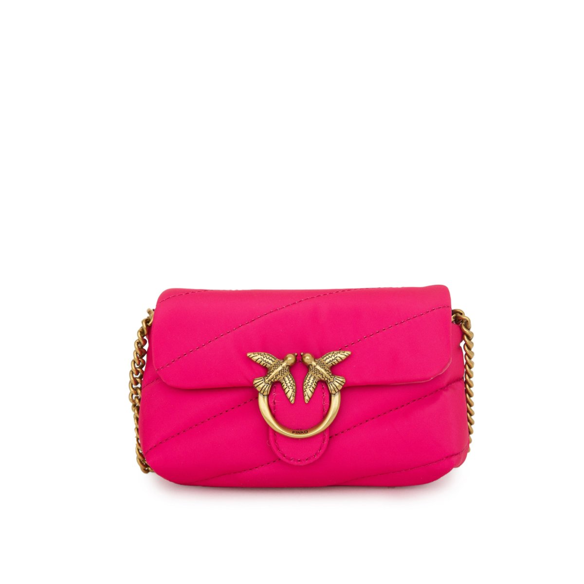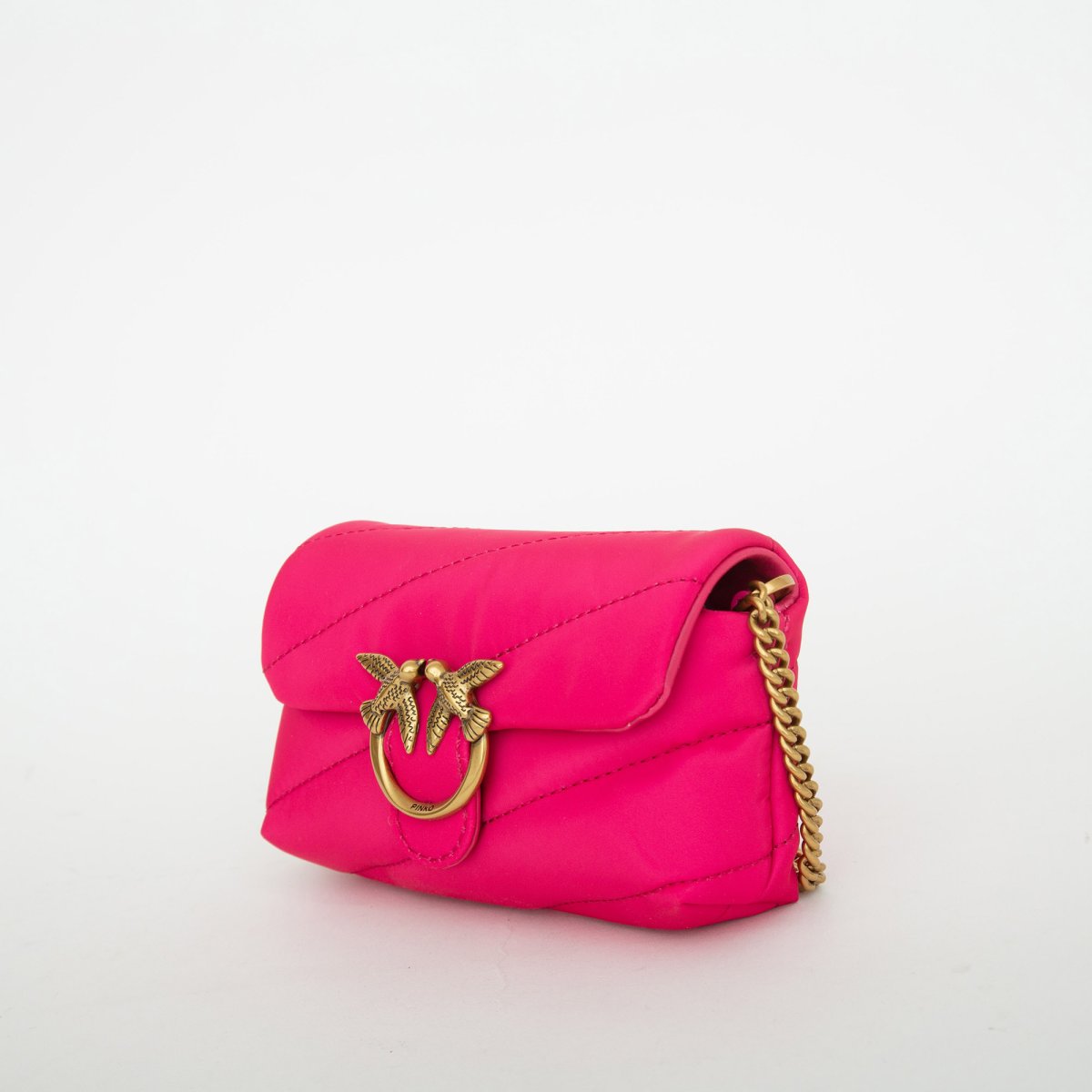 Micro Love Bag Puff in tessuto riciclato con maxi trapuntatura obliqua. La chiusura è completata dall'iconica fibbia in metallo Love Birds Diamond Cut. L'interno è foderato in tessuto tecnico riciclato e comprende una tasca a parete. Completa di tracolla sottile a catena rotonda in metallo.