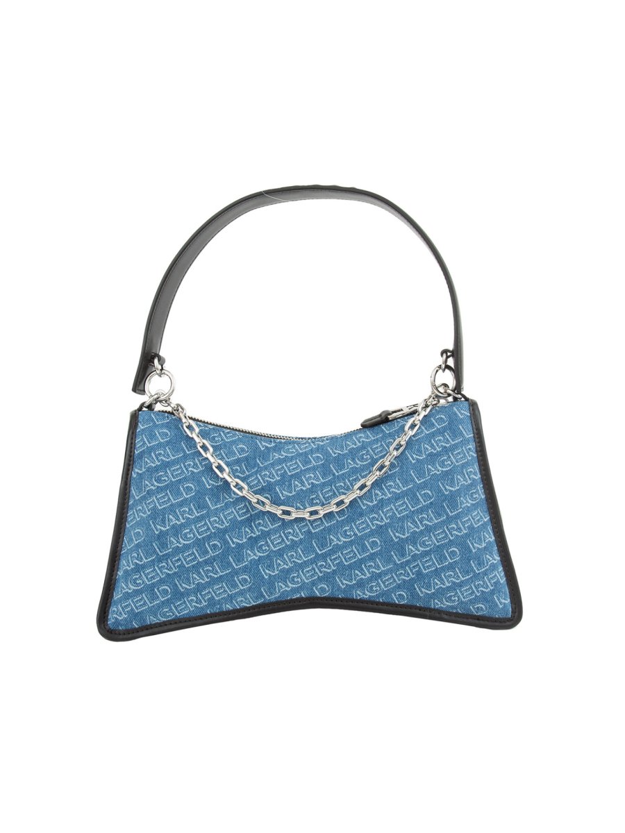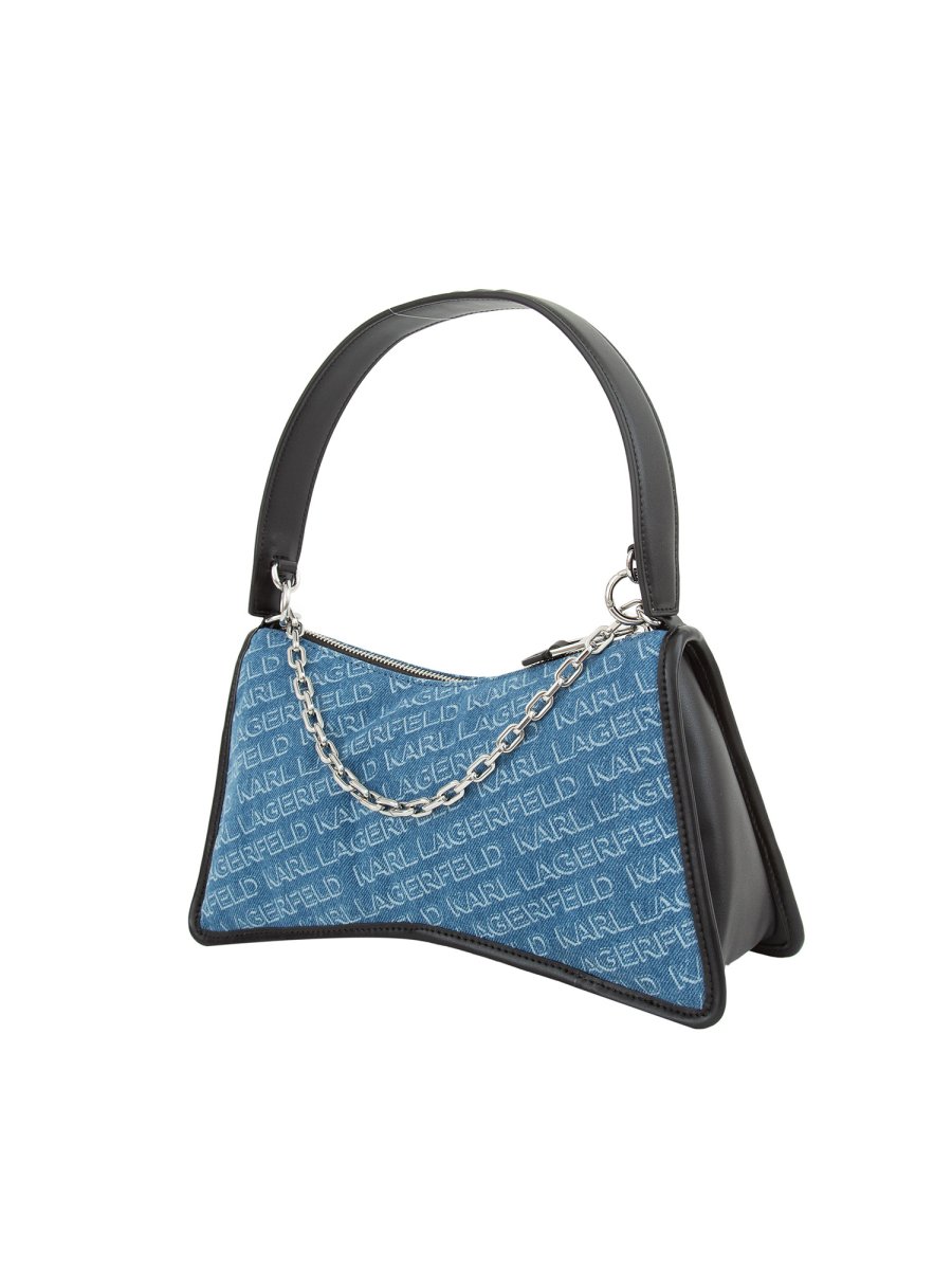 Borsa a spalla della linea K/Seven Element realizzata in denim è ispirata all'iconica lettera K e impreziosita dal logo KARL. Chiusura superiore con zip, tracolla rimovibile e catena decorativa pendente.