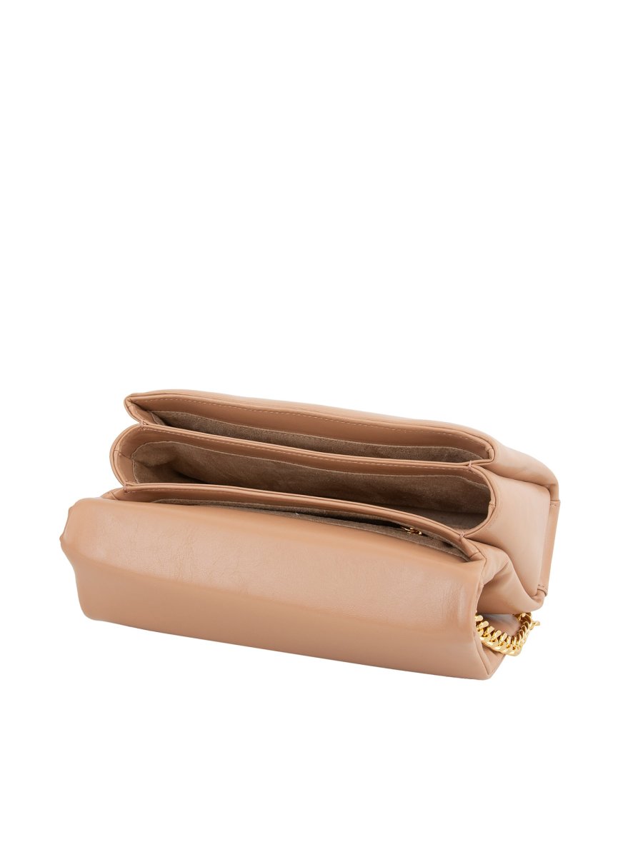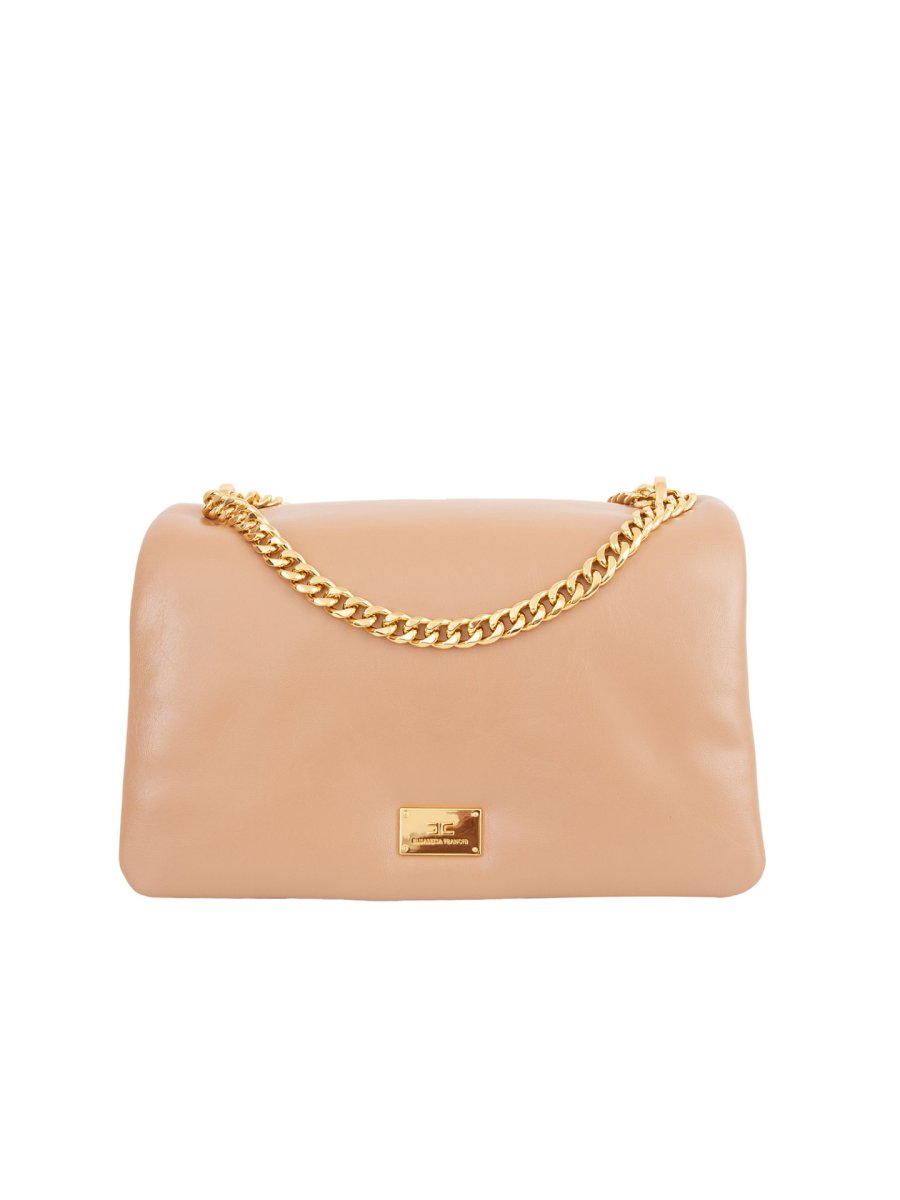 Borsa puffy media Elisabetta Franchi, realizzata in materiale sintetico effetto lucido stropicciato. È caratterizzata da placca logo in metallo dorato e catena regolabile dalla portabilità spalla e tracolla.