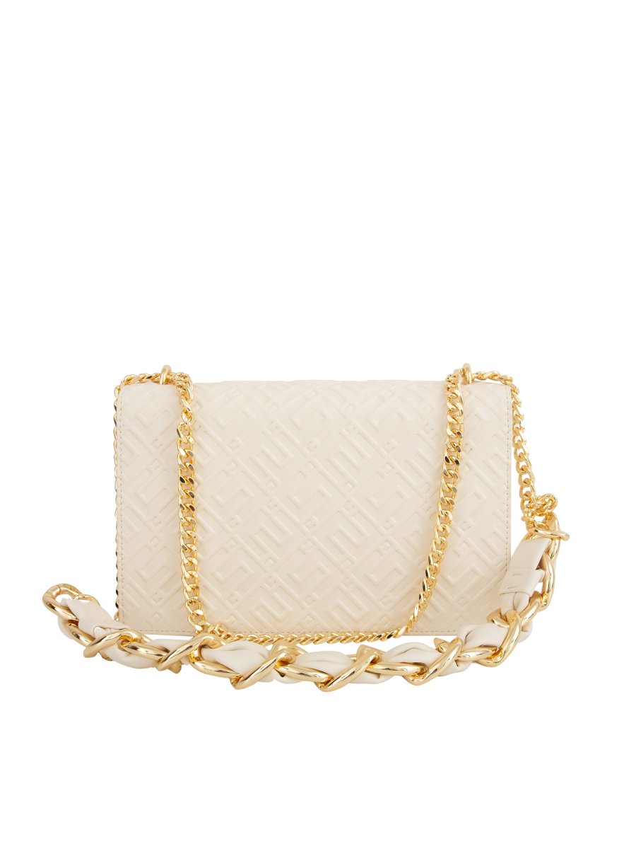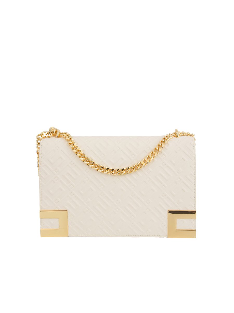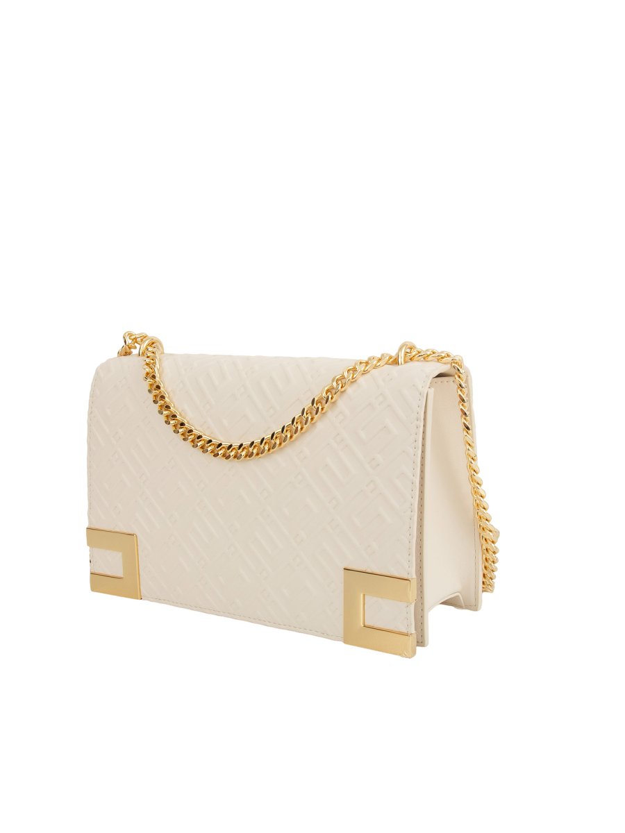 Borsa media Elisabetta Franchi con tracolla regolabile in materiale sintetico effetto nappa con logo embossed all-over. È caratterizzata da placche logo sulla patta e metalli dorati.