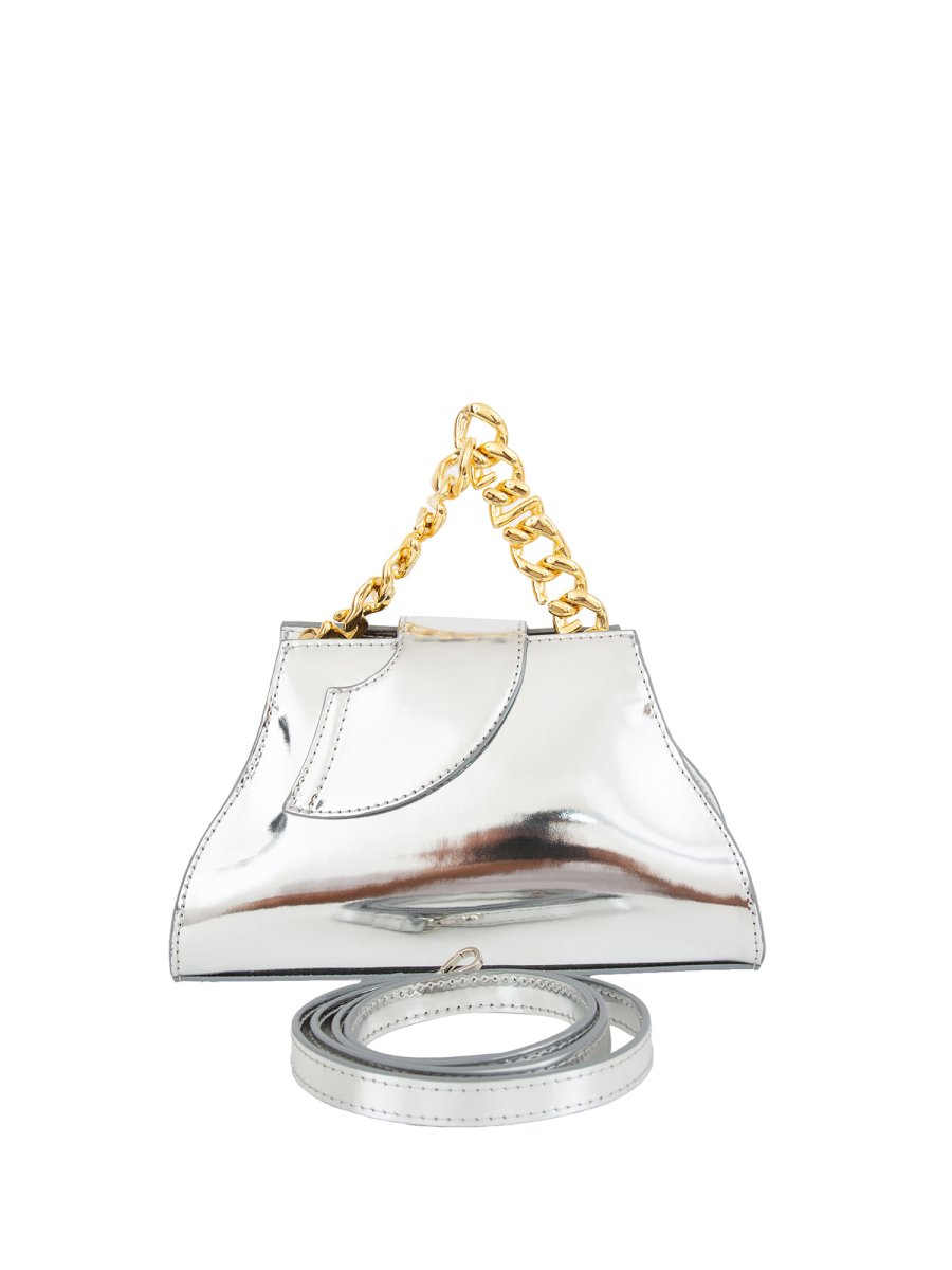 Borsa GCDS comma, dalla particolare forma svasata, formato small, in materiale laminato argento. Patta curva asimmetrica con logo GCDS in nichel lucido sull'estremità e bottone calamitato. Manico con catena logo GCDS in oro lucido a contrasto. Internamente, fodera jacquard in ecrù e tasca porta carte con logo impresso a caldo. Fondo con 4 piedini in nichel lucido.