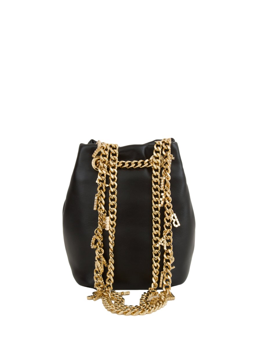 Mini secchiello puffy Elisabetta Franchi in materiale sintetico effetto nappa. È caratterizzata da chiusura esterna a strozzo con fermanodo logato e doppio manico in catena con ciondoli in metallo dorato. Dimensioni 12 x 17 x 11 cm