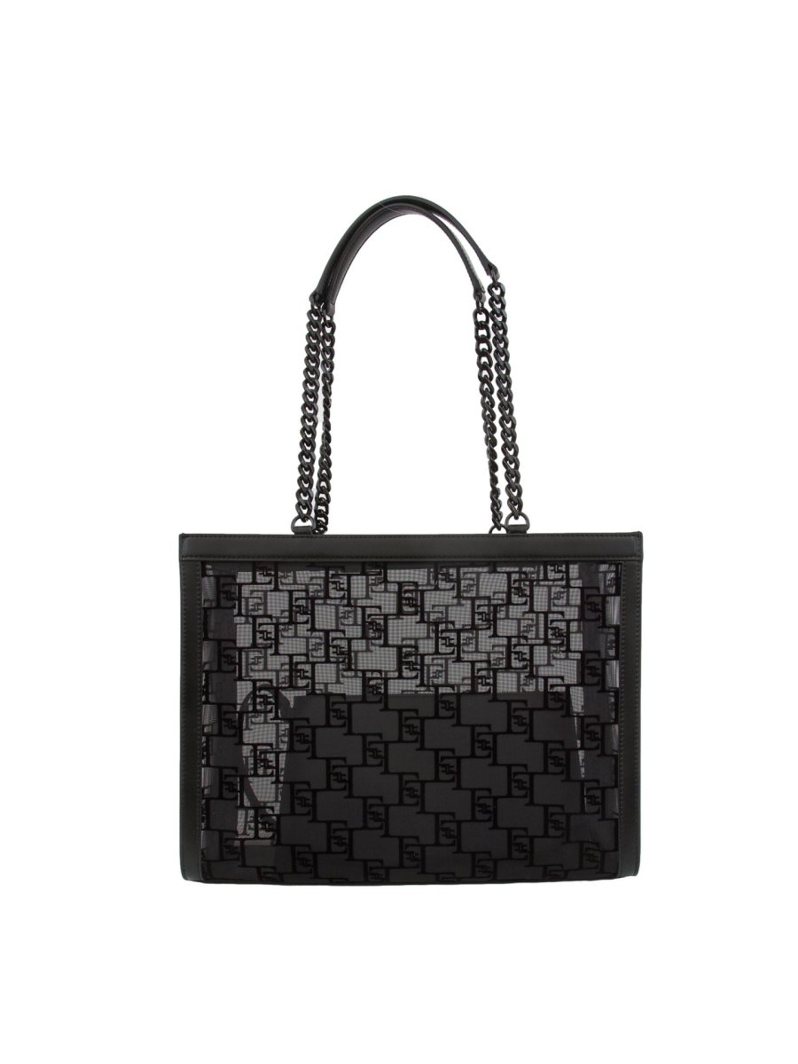 Shopper grande in tessuto rete con lavorazione flock e rifiniture in tessuto effetto pelle. È caratterizzata da doppia tracolla in metallo nero con spallaccio in materiale sintetico effetto pelle.