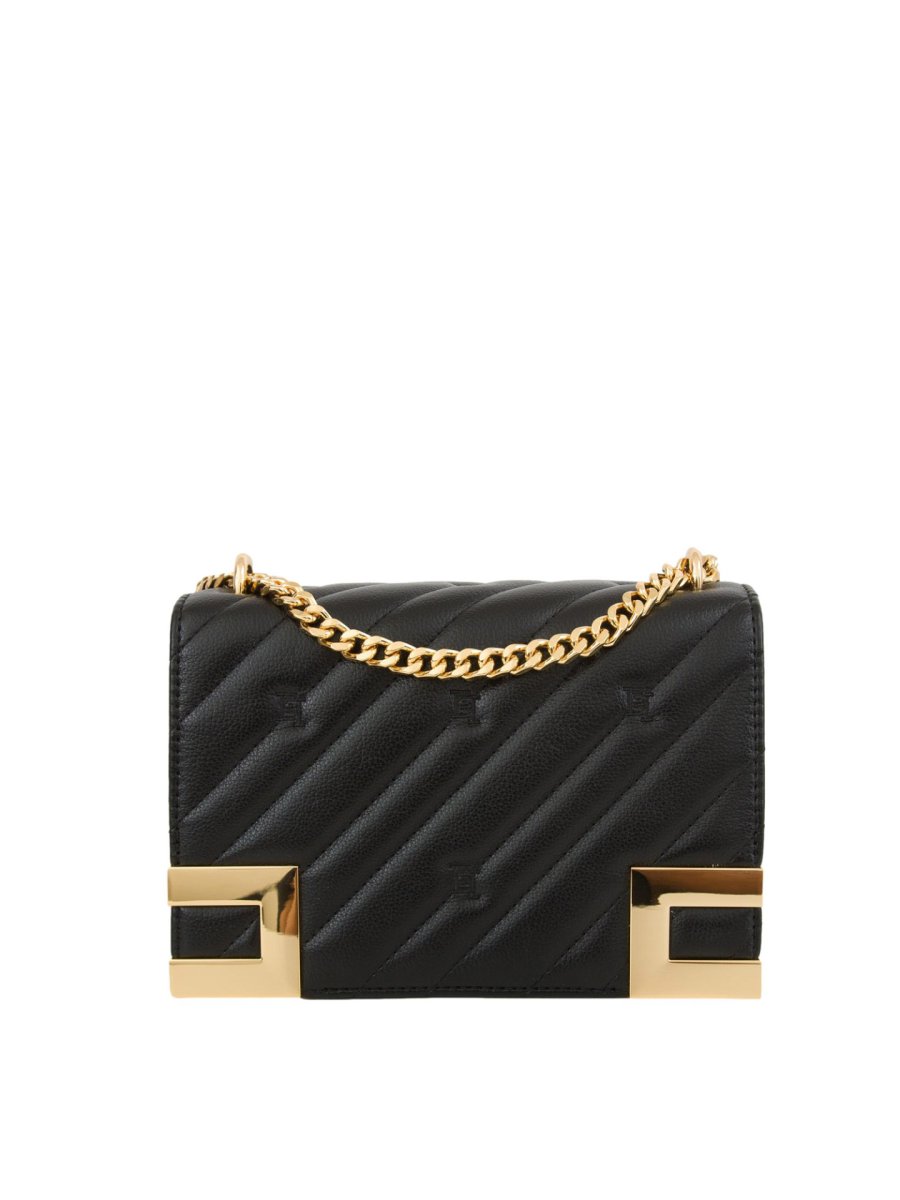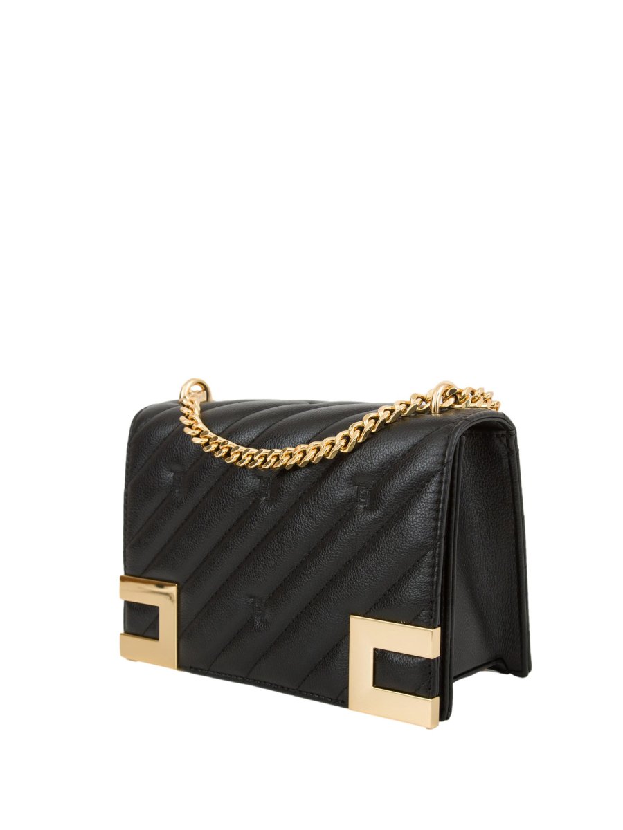 Сумка среднего размера из синтетического материала с эффектом наппы, стеганая отделка с коллекционным мотивом. Модель отличается застежкой-клапаном, бляшками с логотипом по бокам и ремнем с прорезью из золотистого металла для носки через плечо. Размеры: 20 х 14 х 7 см.