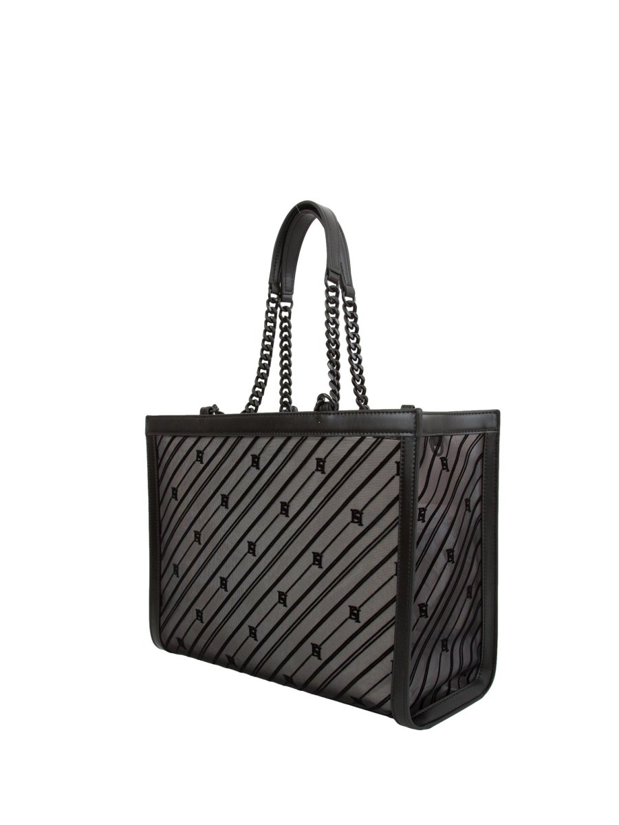 Сумка-шопер из сетчатой ткани с флоковой отделкой и клатч из ткани с эффектом кожи. Модель оснащена двойным плечевым ремнем из серебристого металла и плечевым ремнем из синтетического материала с эффектом кожи. Размеры 35 х 27 х 14 см.