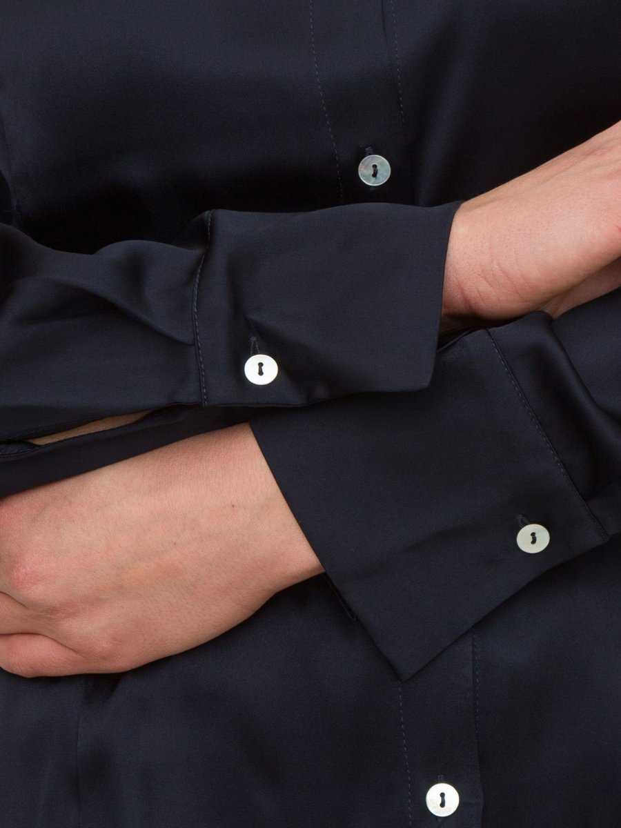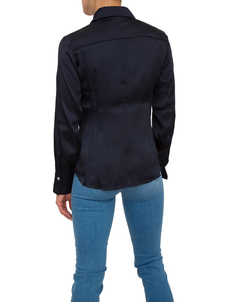 Camicia Marella realizzata in raso lucido misto seta, linea semiaderente, collo a camicia, chiusura con bottoni a vista, maniche lunghe con polsino e bottone e fondo arrotondato.