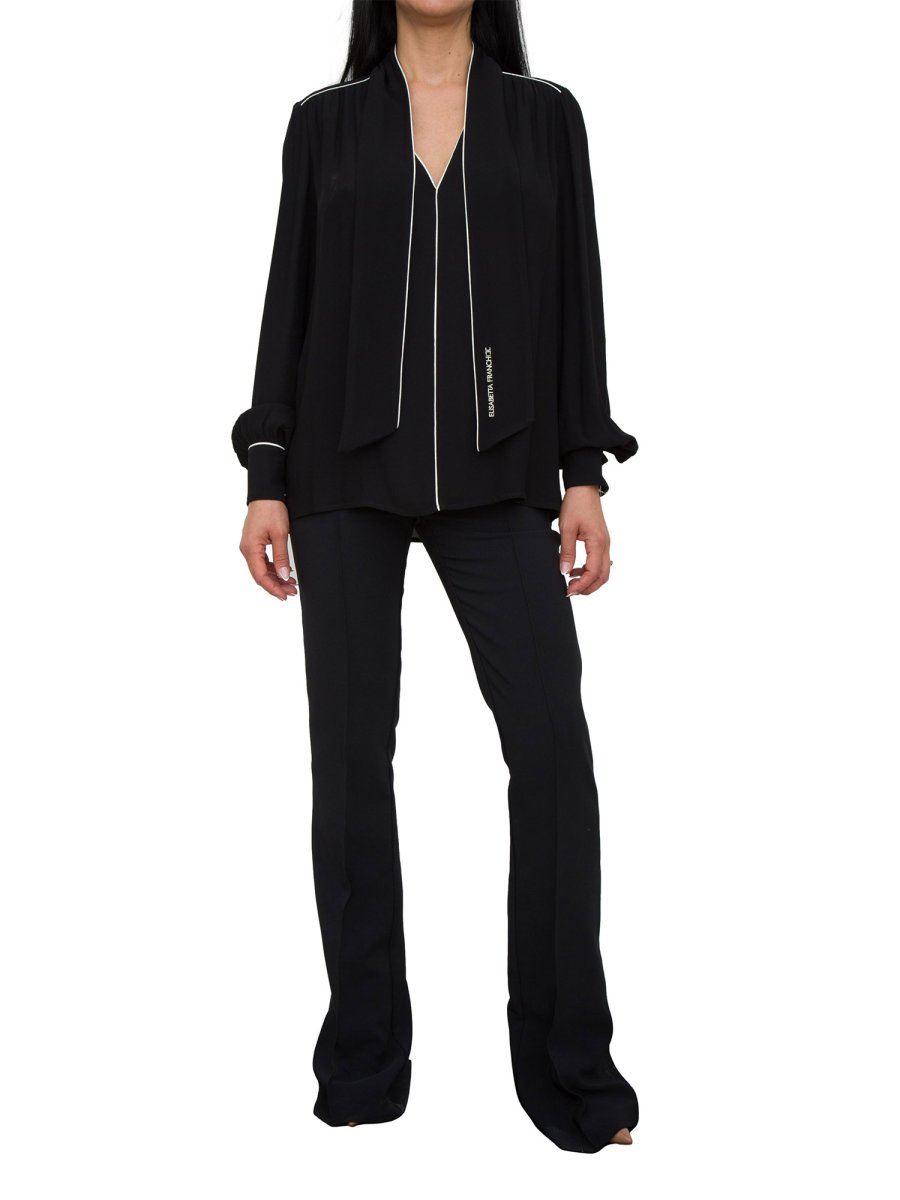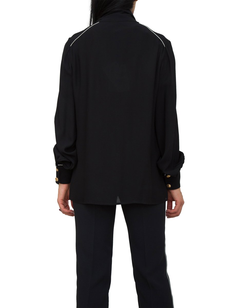 Рубашка из вискозного жоржета с длинными рукавами и классическим кроем. Вырез горловины подчеркивает шарф с вышитым нитью логотипом, а контрастные детали окантовки добавляют четкости. На манжетах — золотые пуговицы с логотипом для придания легкости.