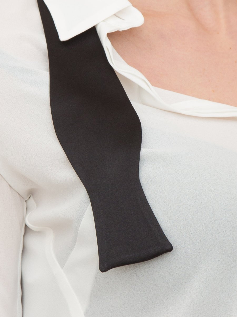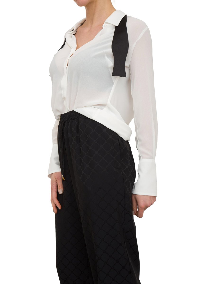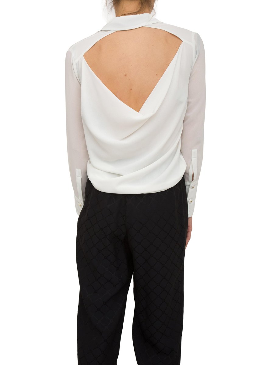 Рубашка из жоржета с длинными рукавами и обычным воротником. Сзади часть спины открыта, благодаря вырезу. Деталью стиля является галстук-смокинг, создающий сбалансированный графический контраст. Пуговицы с логотипом завершают образ. Облегающий крой.