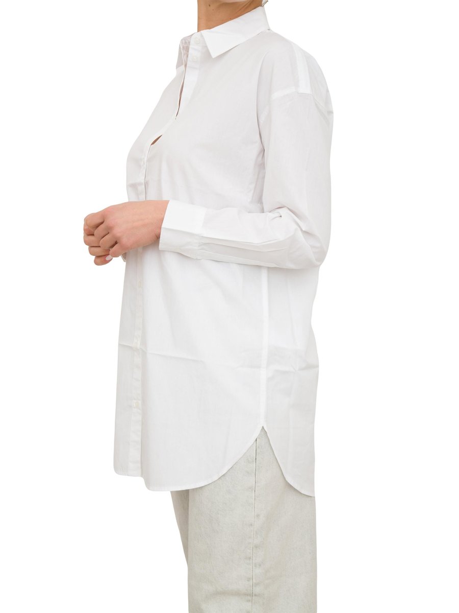Camicia lunga realizzata in popeline di cotone organico. Tinta unita, collo classico, maniche lunghe e chiusura con bottoni.