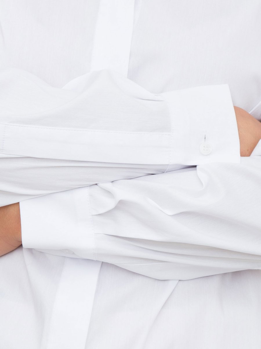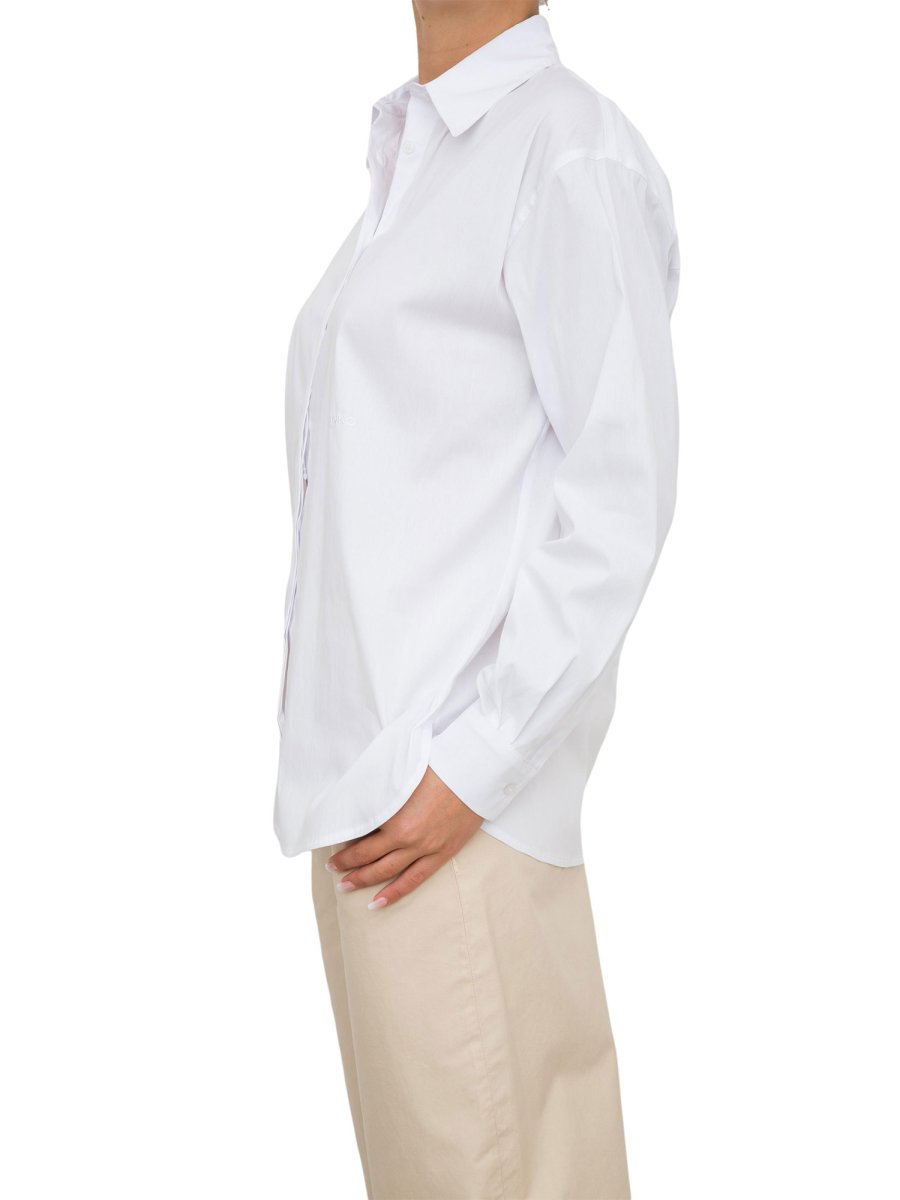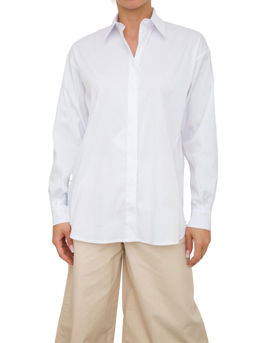 Camicia dal taglio classico, dal volume leggermente oversize, in popeline 100% cotone. Colletto classico e maniche lunghe con polsino al fondo. Mini logo PINKO ricamato davanti. Chiusura coperta con bottoni davanti, soltanto il primo è visibile.