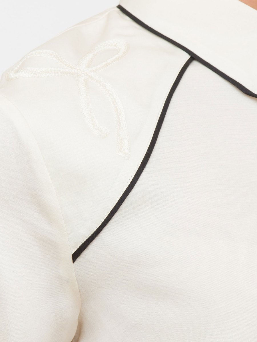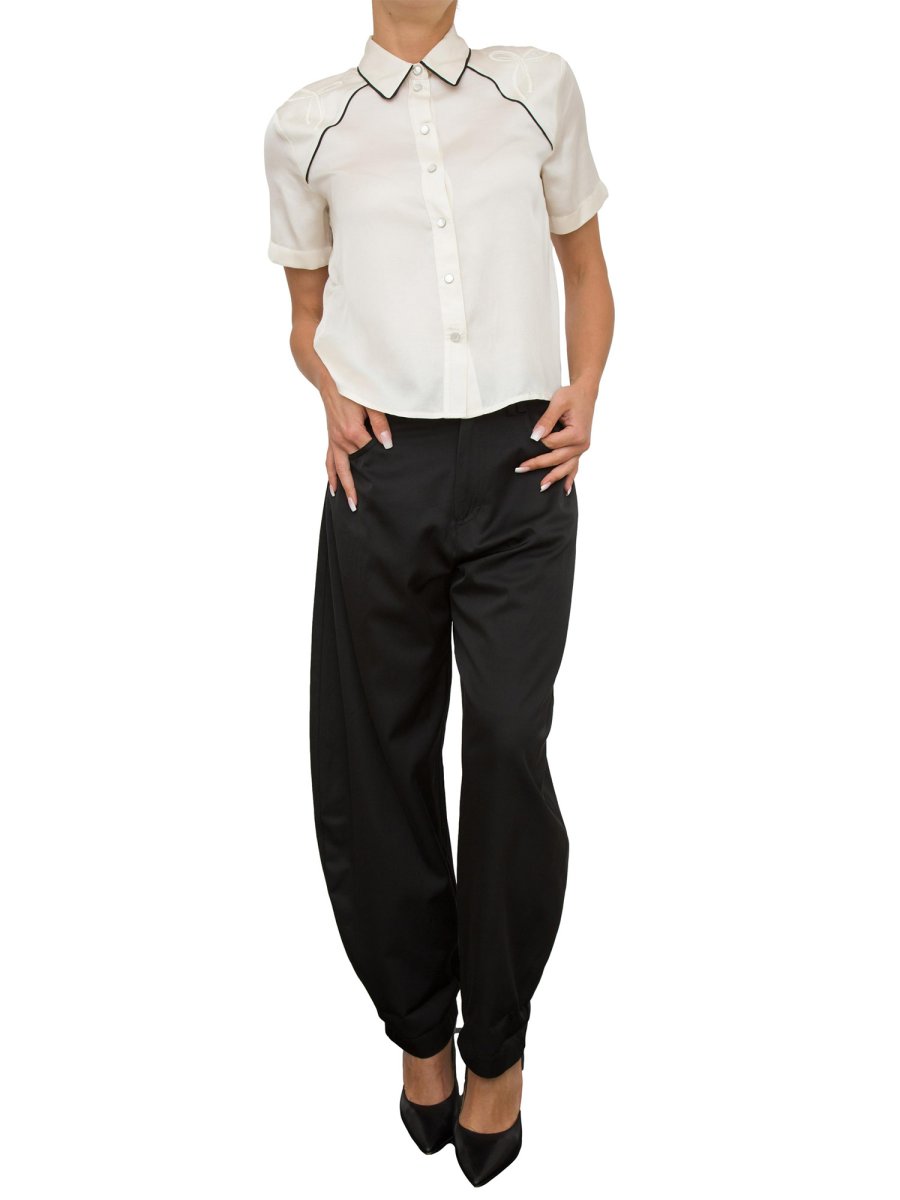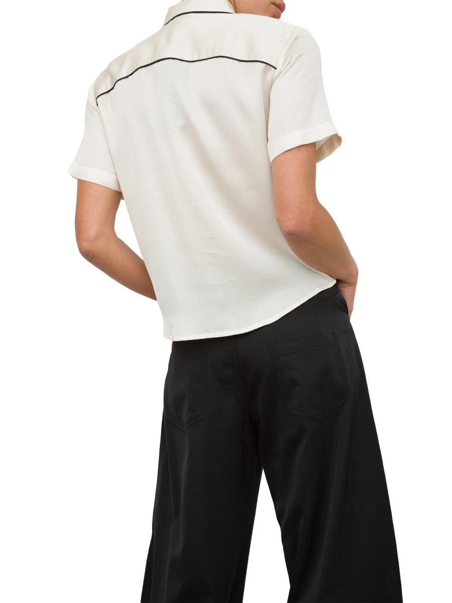 Camicia a mezze maniche in satin di viscosa e cotone caratterizzata da ricamo di ispirazione rodeo sulle spalle. Colletto classico e sprone profilati da piping a contrasto. Chiusura con bottoni a pressione effetto madreperla davanti.
