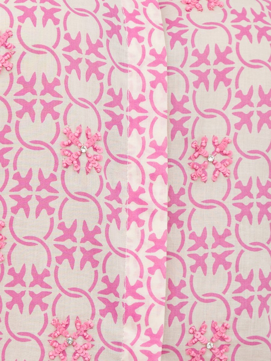Camicia dal taglio classico in mussola di cotone con stampa Love Birds Monogram caratterizzata da ricamo con paillettes in tono colore. Colletto a camicia, maniche lunghe a giro leggermente basso e chiusura con bottoni coperta, solo il primo è visibile.