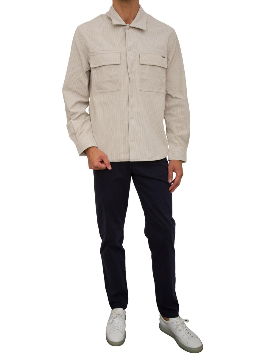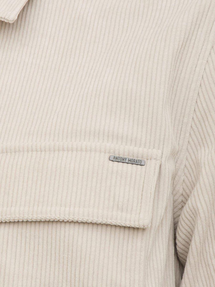 Рубашка с длинными рукавами из мягкого однотонного вельвета. Эта модель имеет стандартный крой и два нагрудных кармана с металлической пластиной с логотипом со стороны сердца. Открытые пуговицы и манжеты на пуговицах дополняют изделие уникального стиля Энтони Морато.