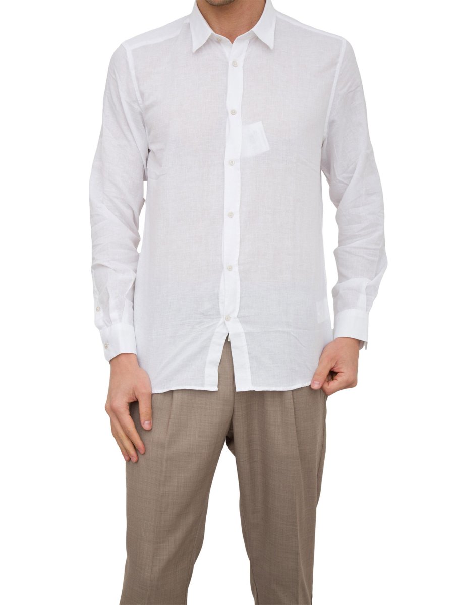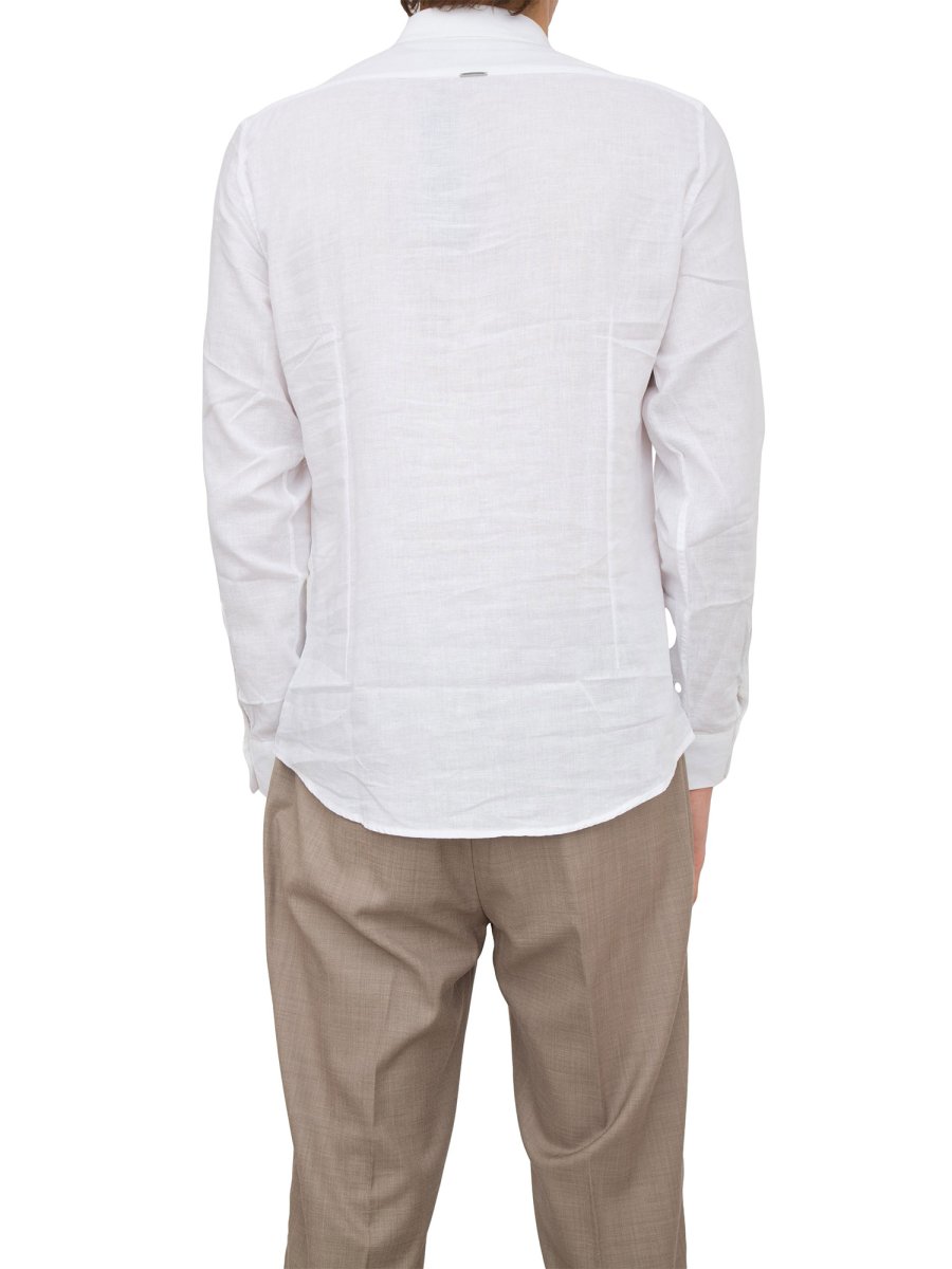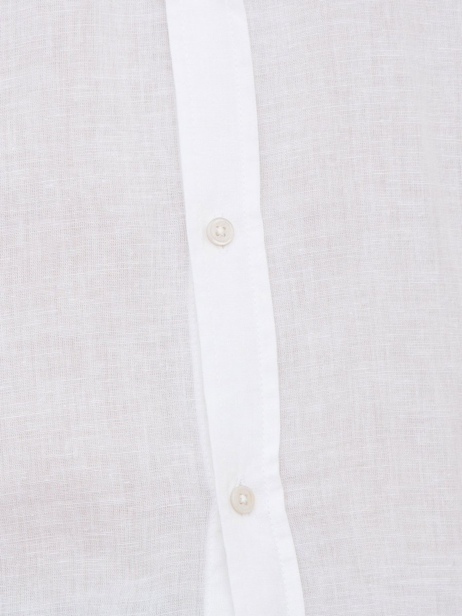 camicia maniche lunghe, senza collo, dalla vestibilitá ampia, con abbottonatura nascosta, in popeline di cotone misto lino e lacchetta logata sul retro.