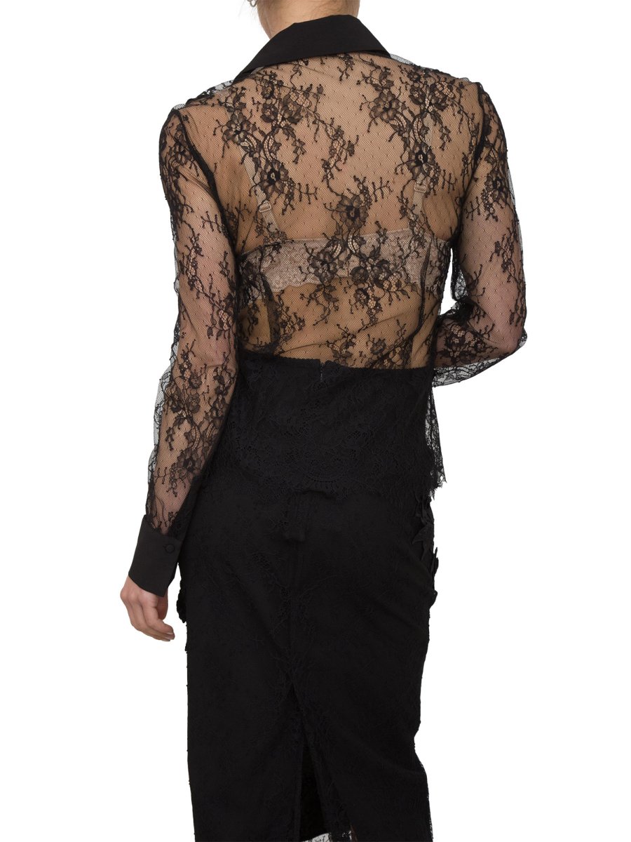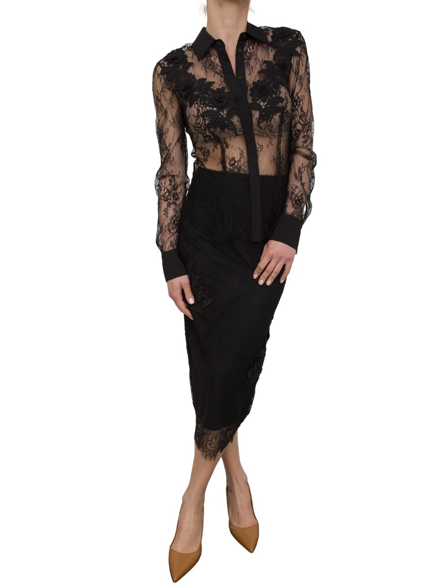 Тонкие объемы и чувственная прозрачность характеризуют эту рубашку Blugirl из кружева шантильи с цветочной аппликацией в стиле макраме спереди. Модель с деталями из крепдешина, классическим воротником, потайной застежкой на пуговицы и длинными рукавами. Романтическая нота, которая преображает каждый образ.