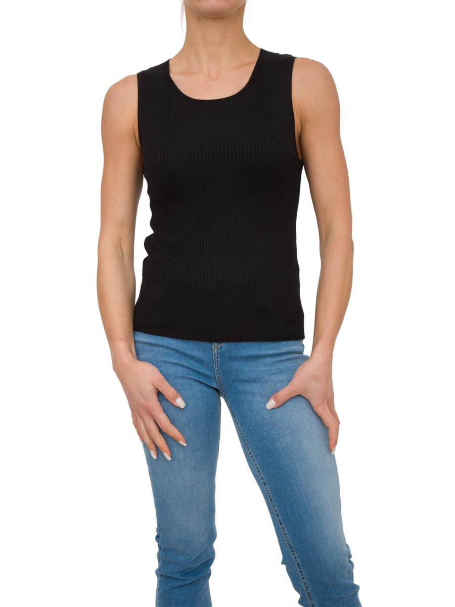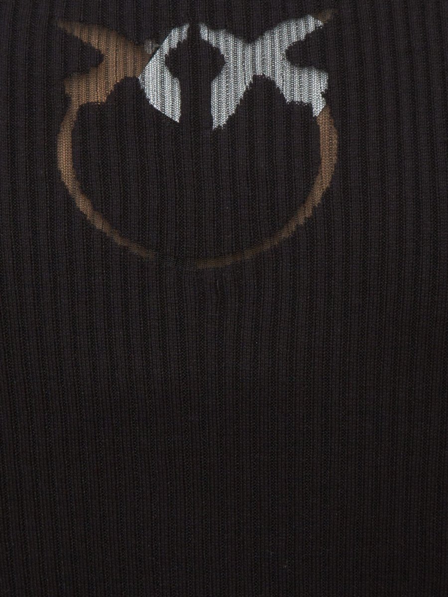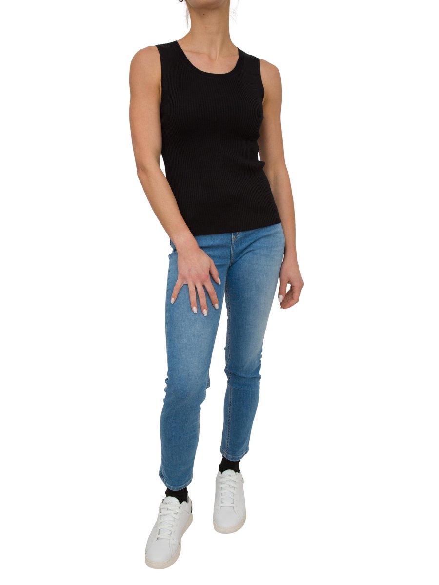 Top senza maniche dalla linea aderente in maglia di misto seta e cotone lavorato a costine. Personalizzazione con intarsio logo Love Birds nel centro dietro, lasciato in trasparenza.