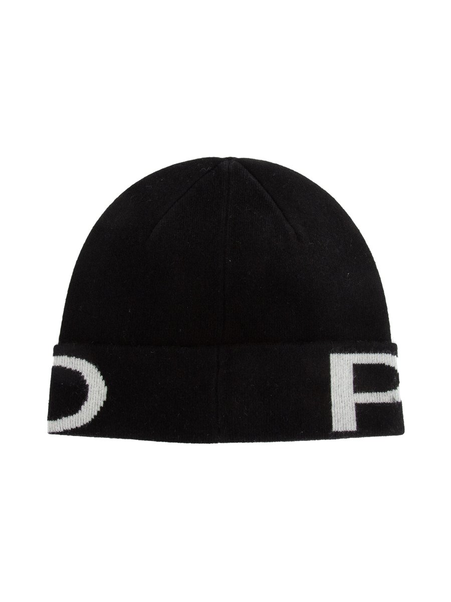Berretto Pinko stile cuffia in filato tubolare di misto lana e cachemire con risvolto caratterizzato da maxi logo.
