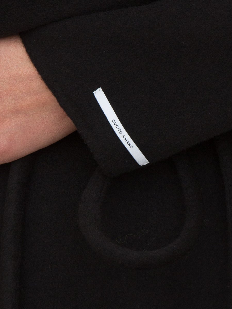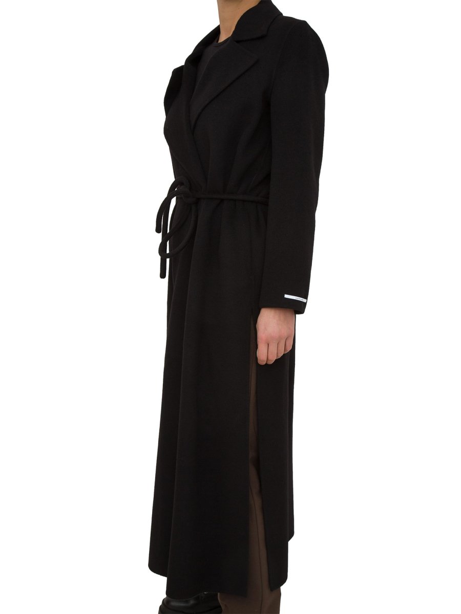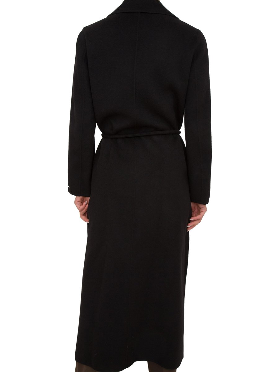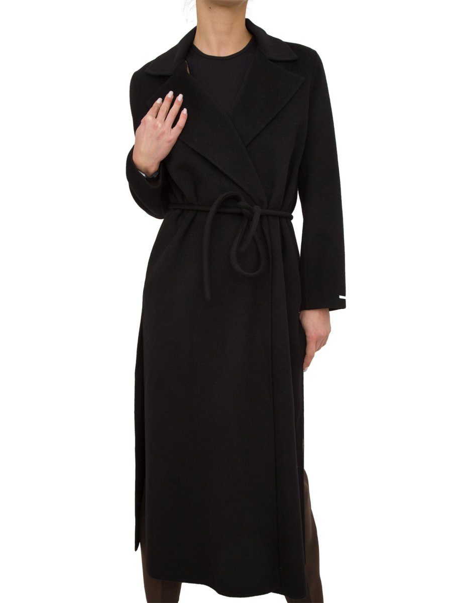 Cappotto in double misto lana, linea morbida. Collo a rever, maniche lunghe. Chiusura con cintura tubolare, tasche inserite sul fianco.