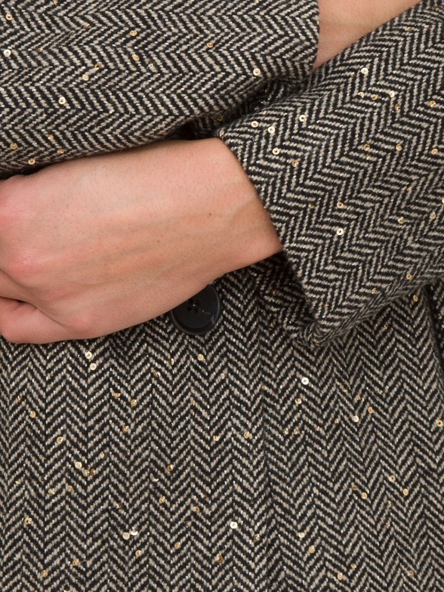 Cappotto lungo da donna Twinset realizzato in misto lana con armatura chevron bicolore con paillettes, chiusura con bottoni, foderato.