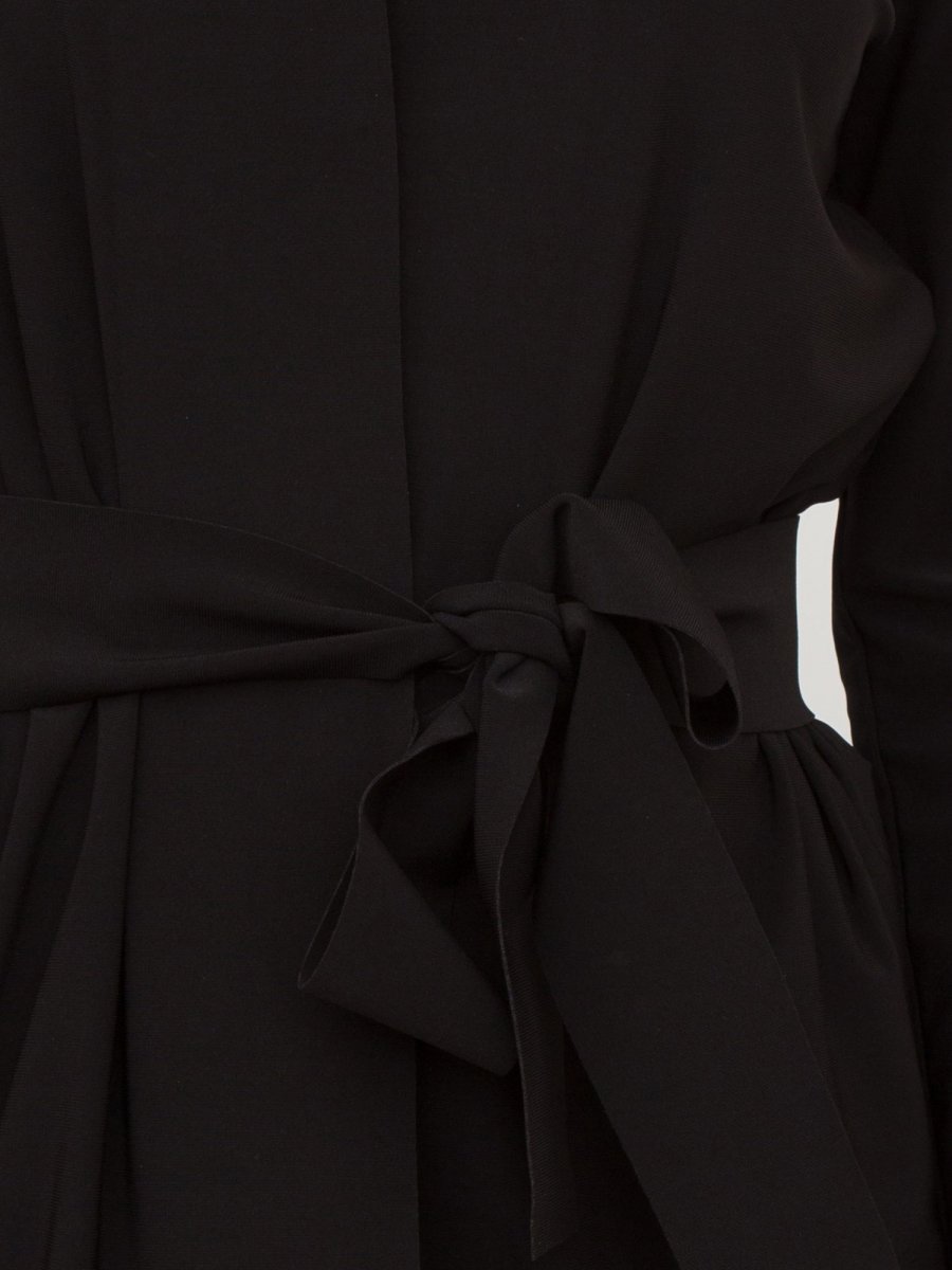 Spolverino lungo realizzato in morbido jersey bistretch, collo sciallato, maniche lunghe a giro e cintura abbinata in vita.