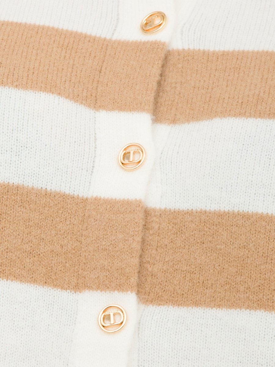 Корейский вязаный кардиган в двухцветную полоску разной высоты, круглый вырез, застежка на пуговицах с логотипом в форме овальной буквы, длинные рукава, контрастный логотип, мягкий крой.
