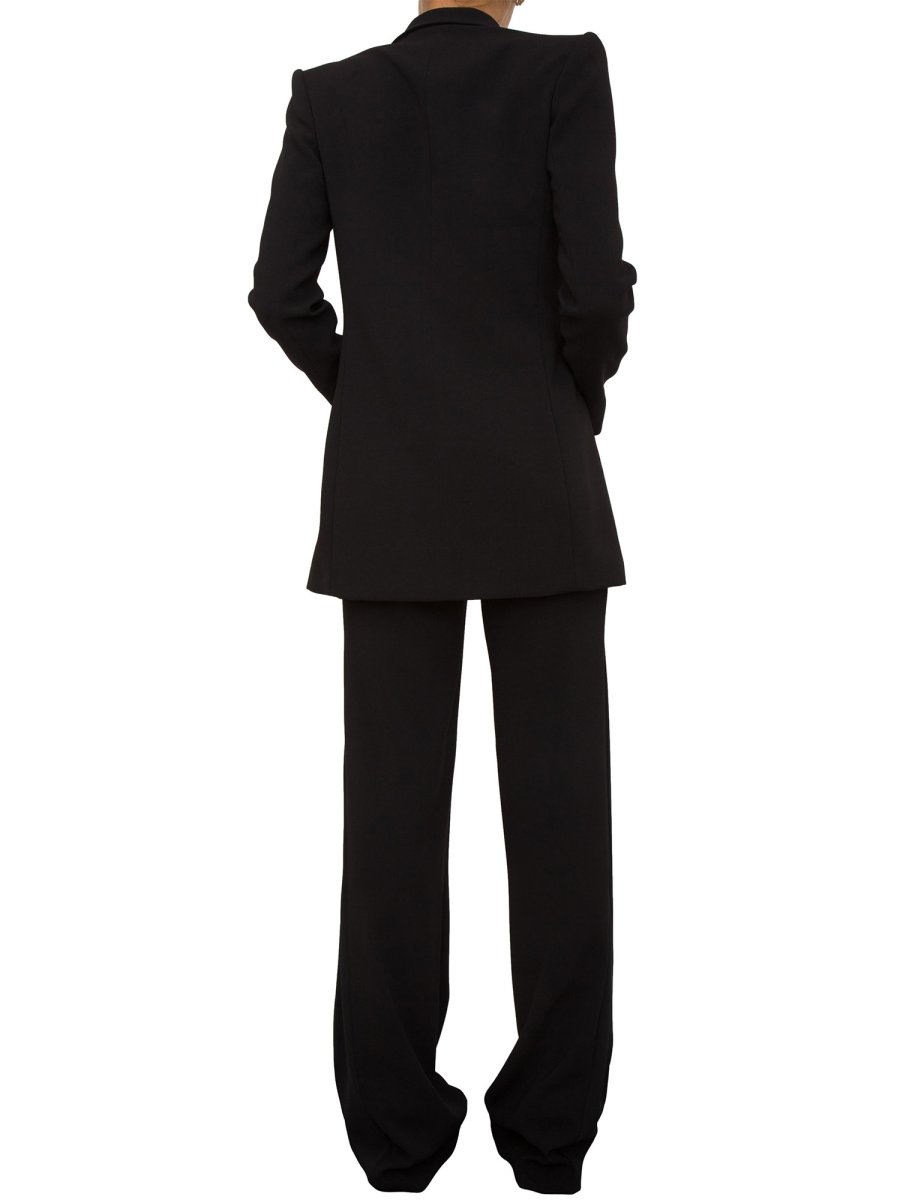 Tailleur in crêpe fluido composto da giacca con spalle strutturate e collo a lancia e pantalone svasato al fondo grazie all'inserto in voile sulle gambe.