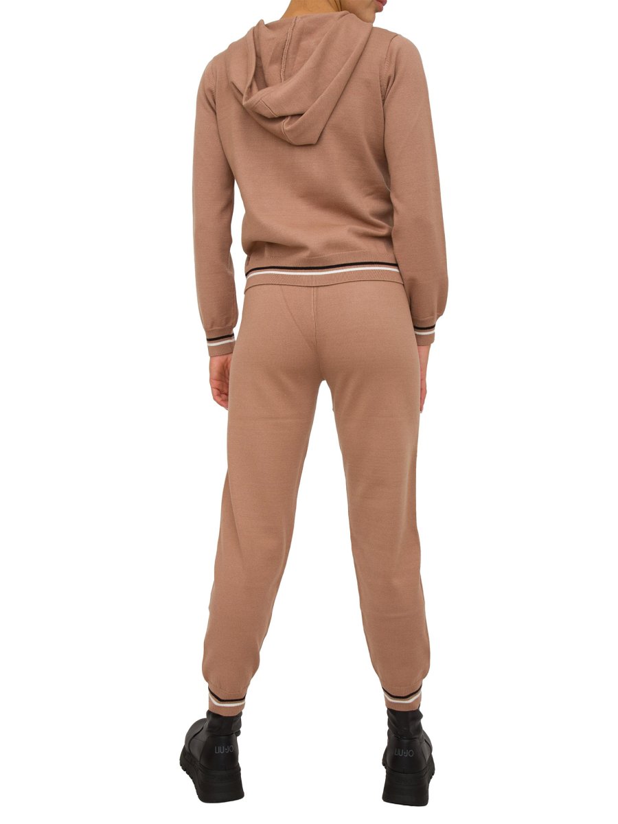 Completo da donna Liu-jo composto da giacca e pantaloni realizzati in morbida maglia di misto viscosa. La giacca presenta un cappuccio con coulisse e chiusura frontale con cerniera. Pantaloni con vita elasticizzata e coulisse. Profili in maglia a costine.