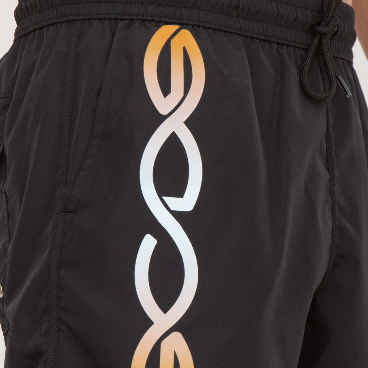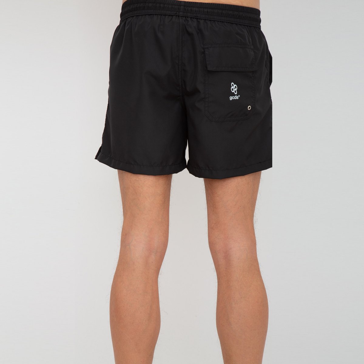 Costume da bagno in nylon con logo "GCDS Chain" sulla gamba destra e logo "Bliss" sulla gamba sinistra. Spacchetti laterali. Tasche all'americana. Elastico in vita e cordino. Dietro, taschino con velcro.