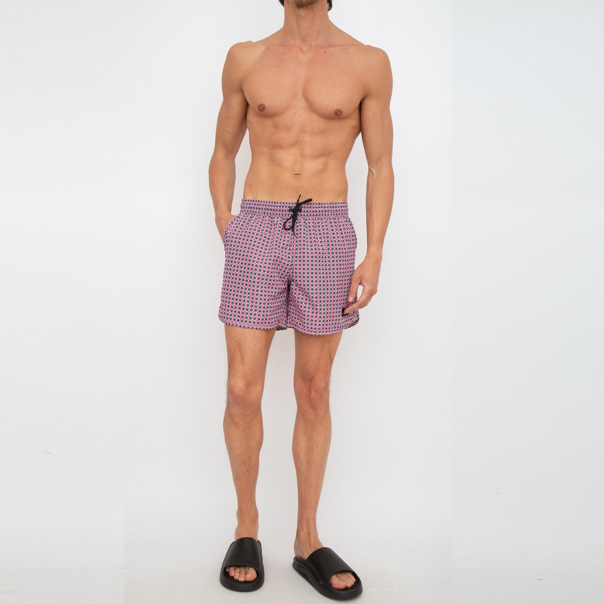 Costume da bagno, applicazione frontale con logo, stampa con logo all-over, vita con coulisse elasticizzata e tasca posteriore con patta.
